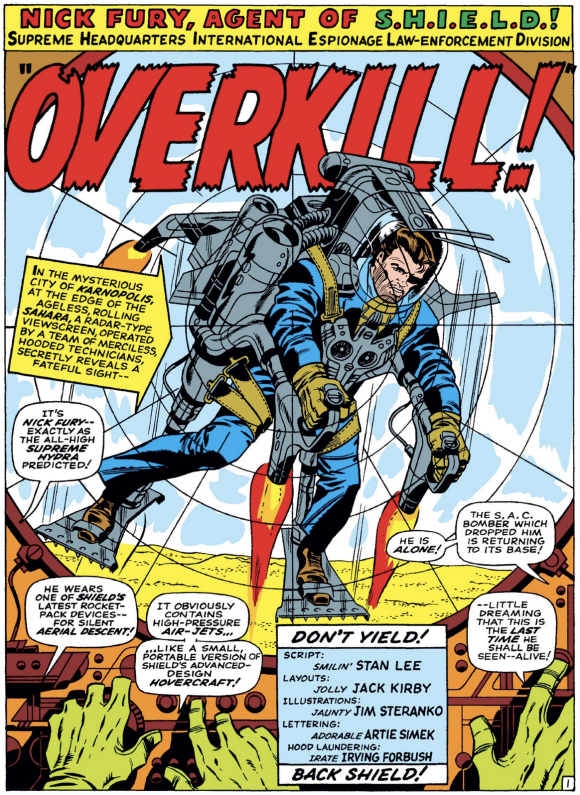 This is the issue (released in May 1965 with an August pub date) where Stan Lee and Jack Kirby took their World War II hero, Nick Fury, and brought him into the Cold War era as a super spy, fully equipped with a never-ending array of high-tech gadgets that would make James Bond’s Q resign from the British Secret Service in shame.