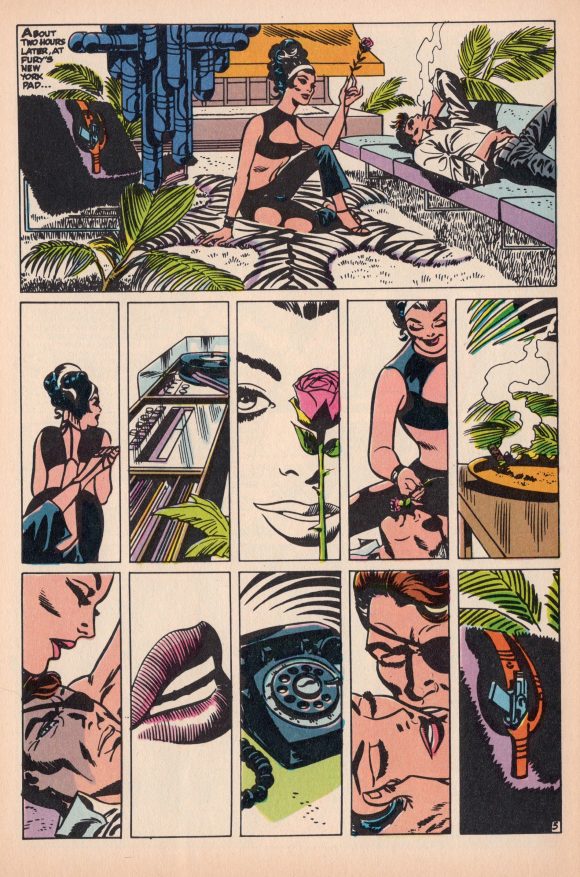 Of particular note in this story is the sendup of Steranko’s famous silent make-out page set in “Fury’s New York pad,” that ended with the notoriously symbolic gun-in-holster panel.