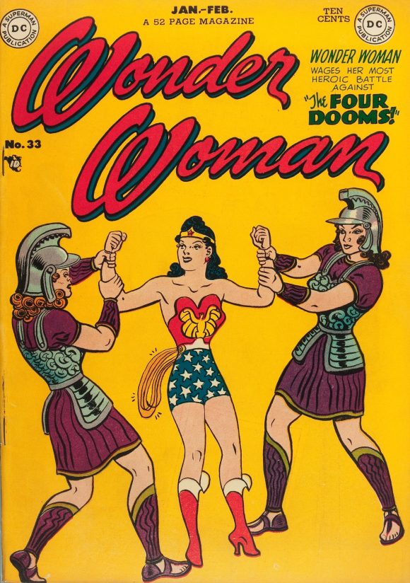 When I first saw the cover to 1949’s Wonder Woman #33, I thought, “That’s a nice cover, but a bit boring.” No offense to artists Irwin Hasen and Bernard Sachs intended.