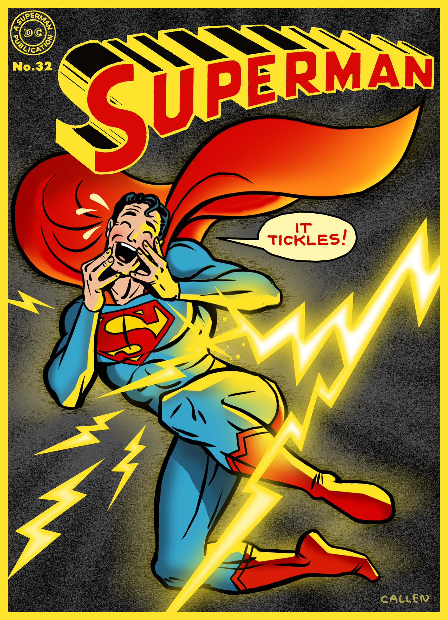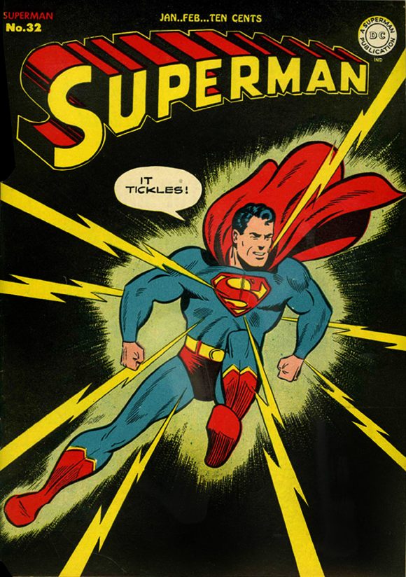 This week we take a look at the classic 1944 Superman #32 cover, pencilled by Wayne Boring. I don’t know if Superman is getting hit by lightning or perhaps an evil scientist’s energy rays. Either way, he’s pretty staid about it. He’s basically just showing off.