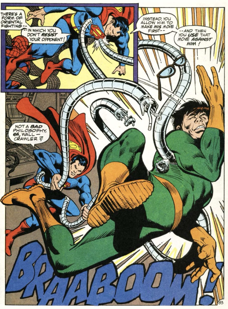 Frustrated, Luthor declares screw it, he’s going to blow up Earth instead of extort it. Doctor Octopus objects to this on the perfectly reasonable grounds that Earth is where all his stuff is. Ock foils Luthor’s plan long enough for Spidey to knock him out and for Supes to turn back a tsunami threatening the US’s Eastern Seaboard. Clark and Lois and Peter and MJ walk off arm in arm, and everyone goes home happy.
