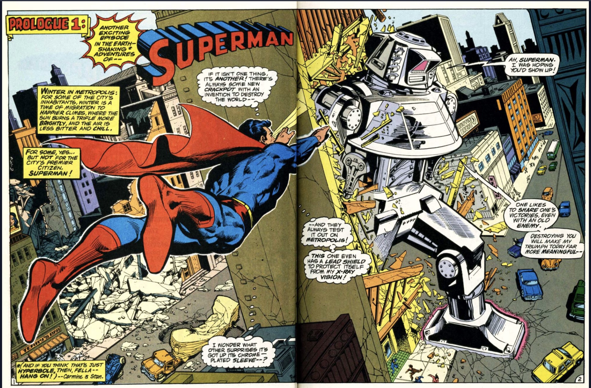 In 1976, we get extended prologues introducing our main heroes, their arch-nemeses, and supporting casts for the benefit for the 12 readers who have never seen them before. Superman defeats a Luthor-driven robot attacking the city, then goes to Galaxy Communications and foils a Steve Lombard prank on Clark Kent, then defeats Luthor himself. Already we see Andru is telling the story in mind-blowing spreads and splashes wherever he can.