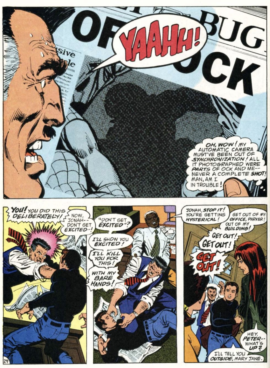 Meanwhile, in New York, Spider-Man stops Doctor Octopus’ goons from ransacking a museum, and delivers the pictures of it to J. Jonah Jameson as Peter Parker. Jameson then orders The Daily Bugle production staff to run whatever is on Peter’s undeveloped film on the front page — before he or Peter has even looked at it — even though it’s a huge photo of nothing at all.