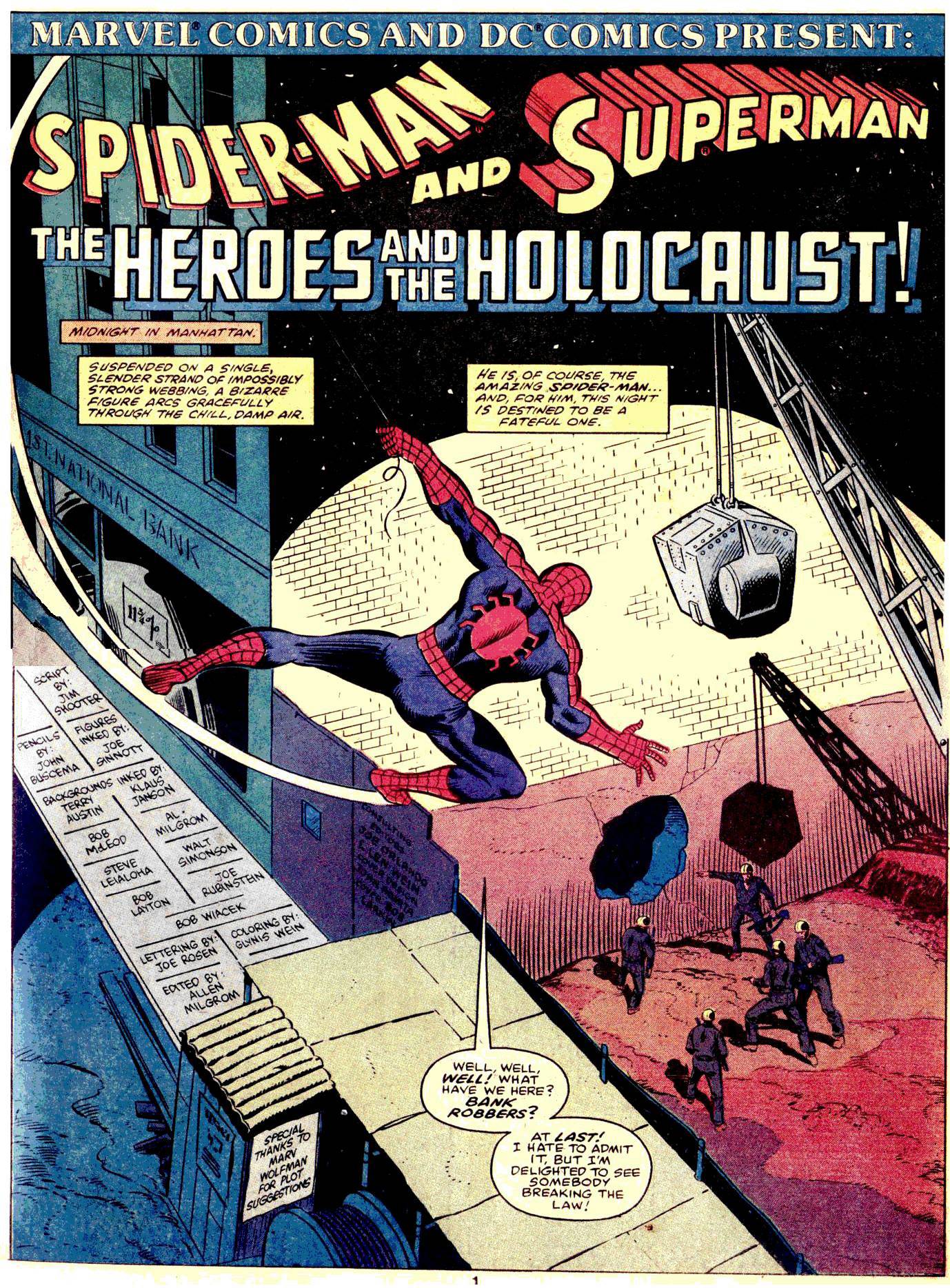 “The Heroes and the Holocaust!” is credited to Jim Shooter scripting, John Buscema pencilling, and Joe Sinnott inking, along with an army of background embellishers. Plus, Marv Wolfman gets a tip of the hat “for plot suggestions.”