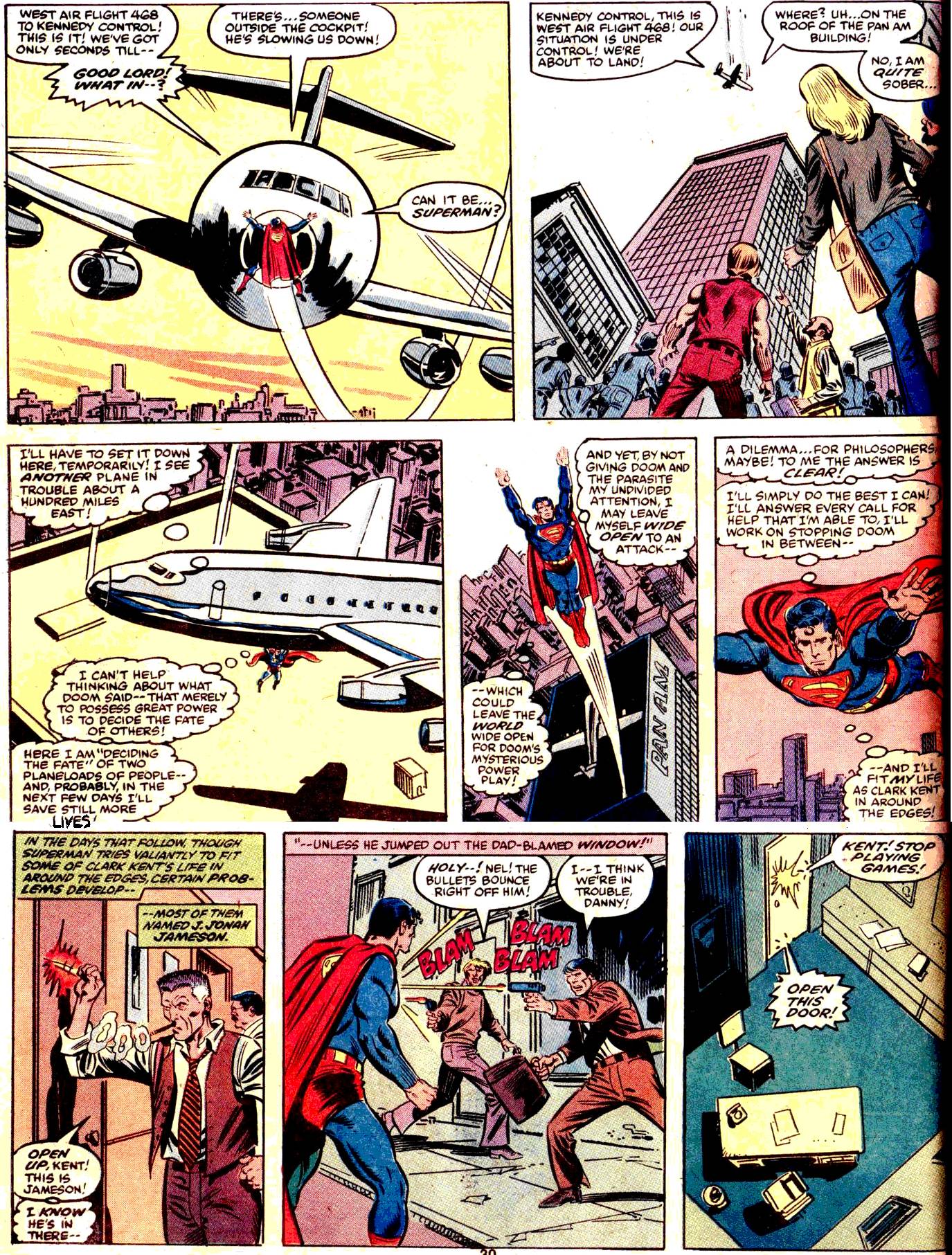 But, on that same page, the big difference between these one-shots is glaringly obvious: In the third panel on an eight-panel page, a jumbo jet plunges directly toward Manhattan, and Superman rather casually stops it and drops it off on a nearby building.