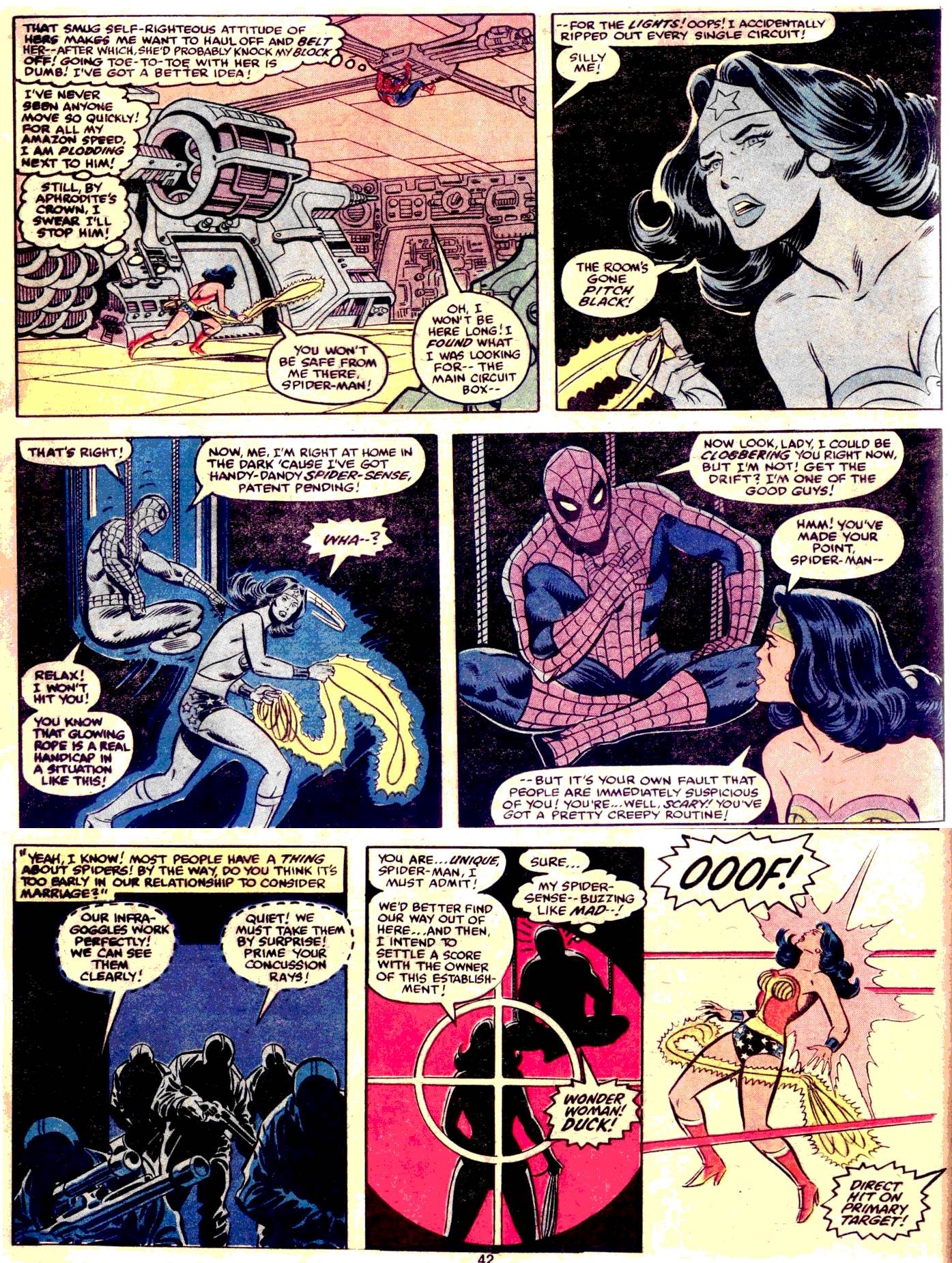 Anyway, our heroes fart around the other’s home city for a bit more, amusingly interacting with each other’s supporting cast (Flash Thompson ripoff Steve Lombard aptly puts a “I Struck Out with Lana Lang” sign on Peter’s back, his reward for which is getting his ass webbed to a chair) until finally Peter’s Spider-Sense leads him to an underground lair where another guest star, Wonder Woman, is being subdued by Dr. Doom’s goons to be lunch for Parasite, though Spidey manages to escape.