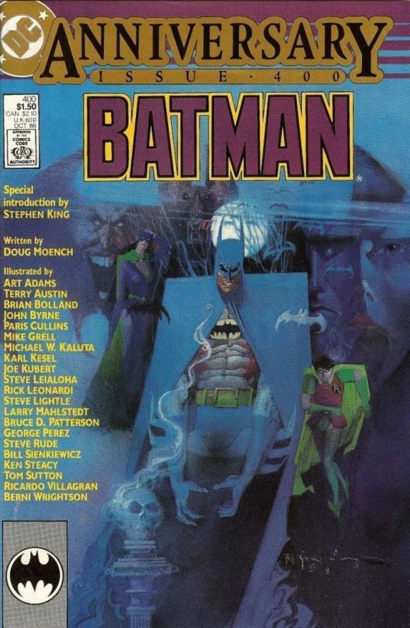 To me, this is the gold standard of anniversary issues: It has appearances by almost all the ongoing Batman villains you can think of, includes all of the supporting cast, has extra pages, no ads, includes a Who’s Who of comics artists, and features an intro by Stephen King that comments on the recent success of Dark Knight Returns!