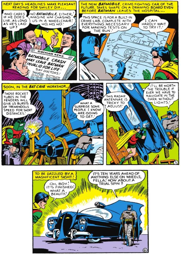 Sprang took the off-the-rack sedan of old and discarded it for a futuristic machine full of crime-fighting equipment. From the knife-edge nose on its bat-head front, to the rocket tubes in the back — which would prove to be a mainstay for all Batmobiles to come — this was a vehicular extension of the hero himself. Sleek, formidable and loaded with gadgets and crimefighting equipment, it set the standard for all of Batman’s vehicles to follow, in print and other media. And it remains a favorite for modern artists to call back to.