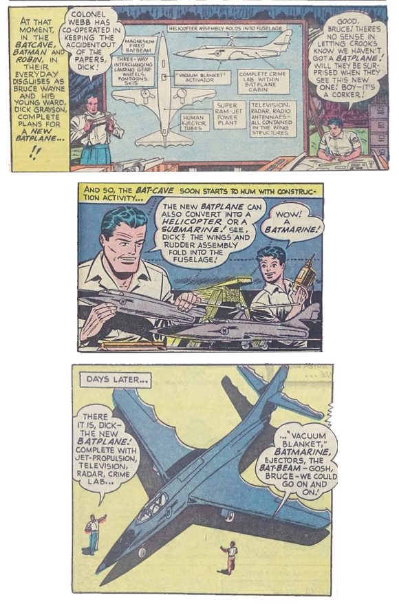 8. Batplane II. Not content to modernize just the Batmobile (see below), Sprang, along with writer David V. Reed and inker Charles Paris, brought Batman’s often-used flying vehicle into the jet age in Batman #61 (Oct./Nov. 1950). The previous model’s bat-head and perpendicular wings were traded in for a sharp nose with a painted bat-head motif and swept-back wings.