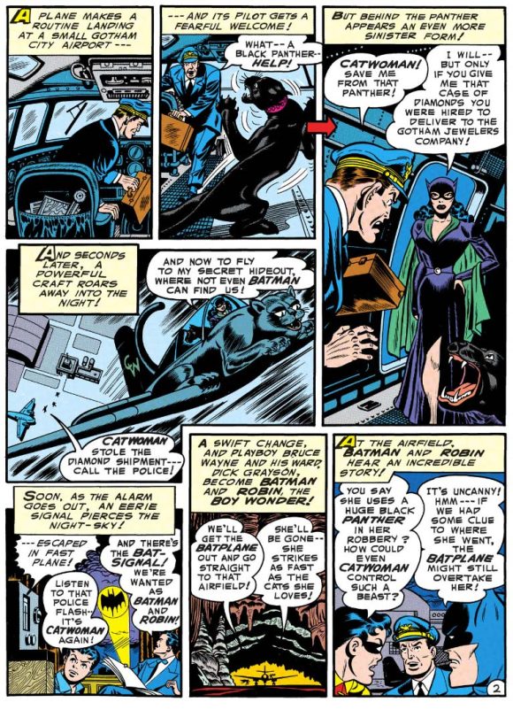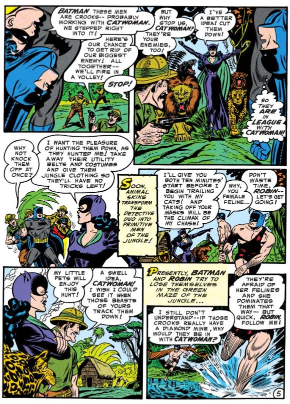 She went out with style, however, as Sprang drew her on the splash, astride a giant tiger, menacing the Dynamic Duo. The story allowed Sprang to design the Feline Fury’s Cat-Jet, and to depict Batman and Robin stripped down to only their masks and some Tarzan-like loincloths! Sprang drew perhaps the most sultry and glamorous Catwoman readers had seen to date.