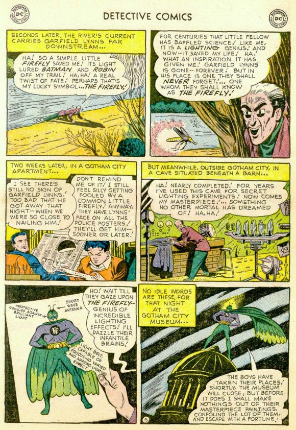 13. Firefly. Sprang and writer France E. Herron created Firefly for Detective Comics #184 (June 1952), initially conceived as a stage-lighting technician who turned to crime. He had relatively few appearances but was reimagined by Chuck Dixon and Graham Nolan for Detective Comics #661 as a pyrotechnic expert turned arsonist. This version has stuck, and the character has made it into various other Batmedia. But the initial inspiration remains.