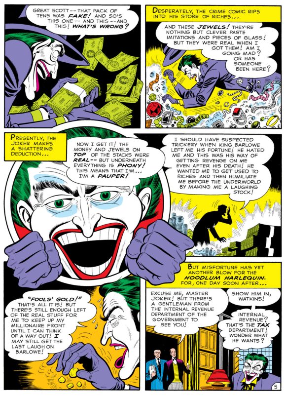 Sprang’s Joker was widely utilized on merchandise released during the ’60s Batmania, and would continue to resonate, appearing in The New Batman Adventures episode “Legends of the Dark Knight” (along with Sprang versions of Batman and Robin) and become the basis for the character design of the Harlequin of Hate on Batman: The Brave and the Bold. Mezco Toyz also based their recent Golden Age Joker figure primarily on Sprang’s interpretation.