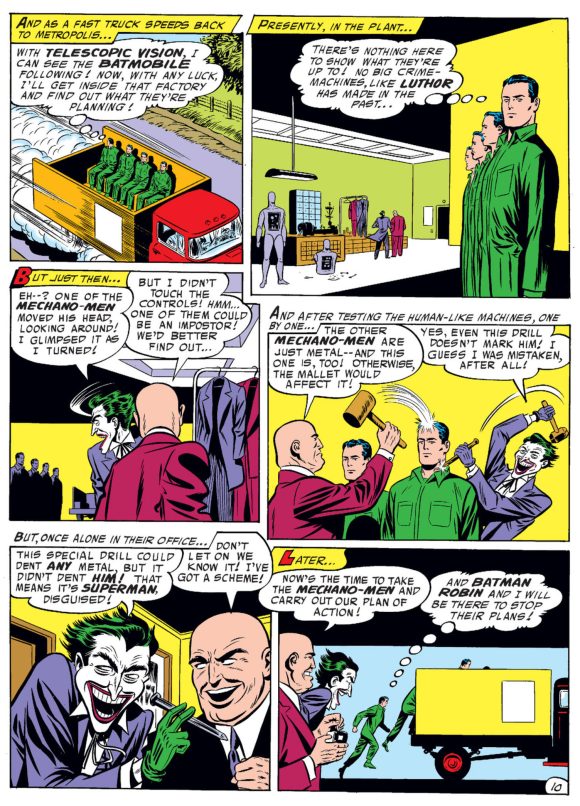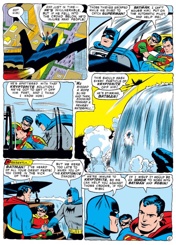 They flash back to the first time they met the Man of Steel, and saved him from Kryptonite poisoning. Of course, in the present, Superman was only trying to protect his friends from Luthor’s latest evil contraption. But this charming tale, written by Edmond Hamilton and inked by Charles Paris, has endured and shown up in just about every “Greatest Stories” compilation you can imagine, for both Batman AND Superman!