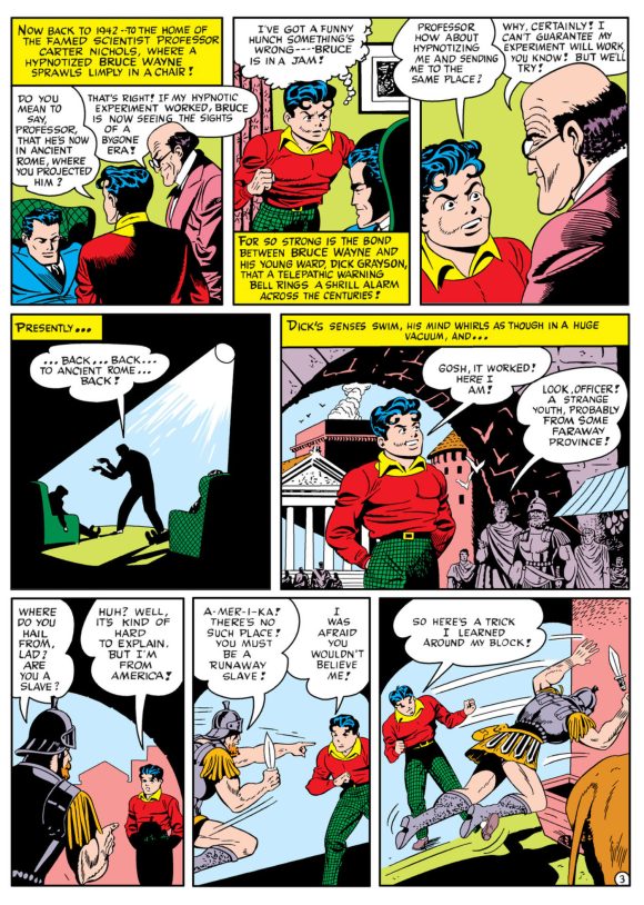 9. Professor Carter Nichols and Time Travel A co-creation between writer Joe Samachson and Sprang, Professor Carter Nichols debuted in Batman #24 (Aug./Sept. 1944) hypnotizing Bruce Wayne and Dick Grayson and sending them back through time to ancient Rome. Carter made 40 appearances across the Golden and Silver Ages, using hypnotic methods and later a time ray to send Batman and Robin to various points in history.