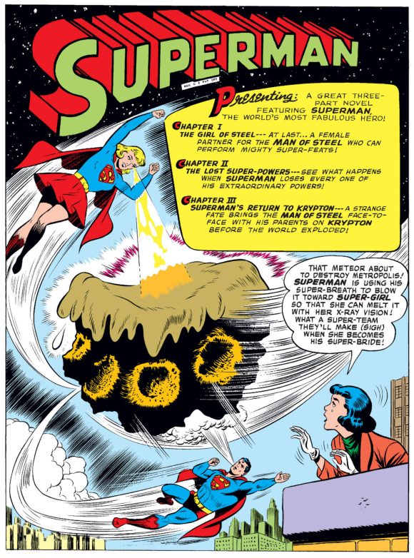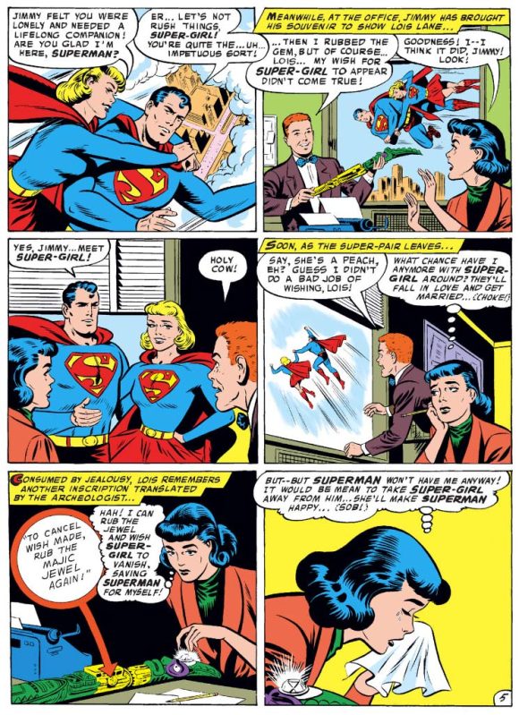 Like her later, more famous namesake, the hyphenated Super-Girl is blonde, and wears a dress that mimics Superman’s uniform, including a red skirt that Kara Zor-El will adopt decades later. Super-Girl interferes with Superman several times, and when she is fatally exposed to Kryptonite, Jimmy wishes her away to spare her suffering. Binder, with Al Plastino, went on to co-create the Kara Zor-El version in Action Comics #252 (May 1959), but Sprang was there for the trial run!