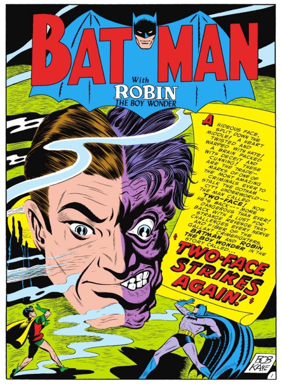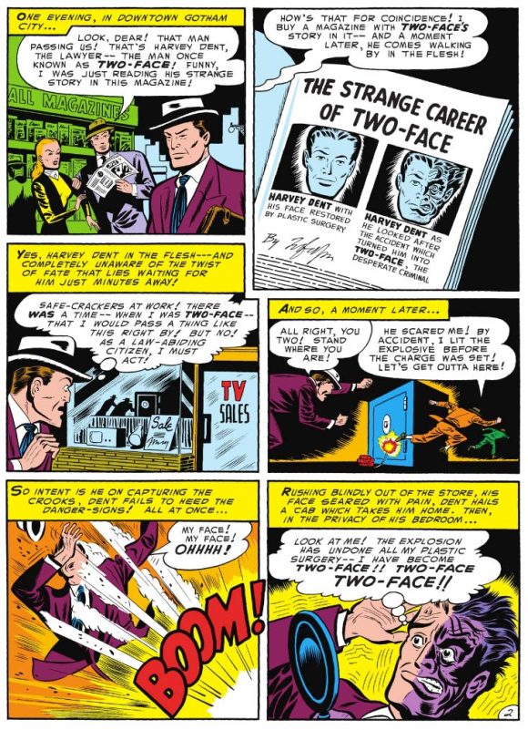 11. The Definitive Golden Age Two-Face. Although created by Finger, Kane and Robinson, the iconic image of the Golden Age Two-Face belongs to Sprang, even though he only drew one tale featuring the character. Sprang defined the nuances of Two-Face’s disfigured left side like none had before him, and it proved to be influential to artists who picked up the character after this, his final Golden Age tale.