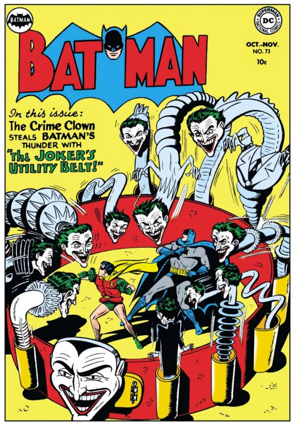 4. The Joker’s Utility Belt. No doubt the most famous Joker story Sprang illustrated, “The Joker’s Utility Belt” from Batman #73 (Oct/Nov 1952) has proved to be an undeniable classic. David V. Reed’s tale of the Joker devising his own arsenal to compete with Batman’s was given a serious boost by Sprang’s inspired pencils. But this was no more evident than the matching cover and splash page by Sprang and inker Charles Paris, showing the Dynamic Duo encircled in the Clown Prince of Crime’s new fashion accessory, while grotesque copies of the grinning ghoul spring upon them.