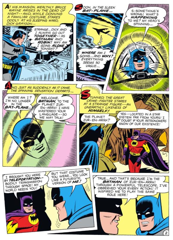 12. Batman of Zur-En-Arrh. An obscure footnote in Batman’s history until resurrected by Grant Morrison during his “Batman: RIP” story arc, the Batman of Zur-En-Arrh teleported our Caped Crusader to his world in Batman #113 (Feb. 1958). Herron handled the scripting chores and Paris the inks, but Sprang designed this alternate Batman, who observed Bruce Wayne from afar, and based his advanced crimefighting identity and equipment on him. Sprang was ahead of the curve, giving the futuristic Masked Manhunter a bat emblem with a yellow circle behind it, predating the “New Look” costume change by six years!