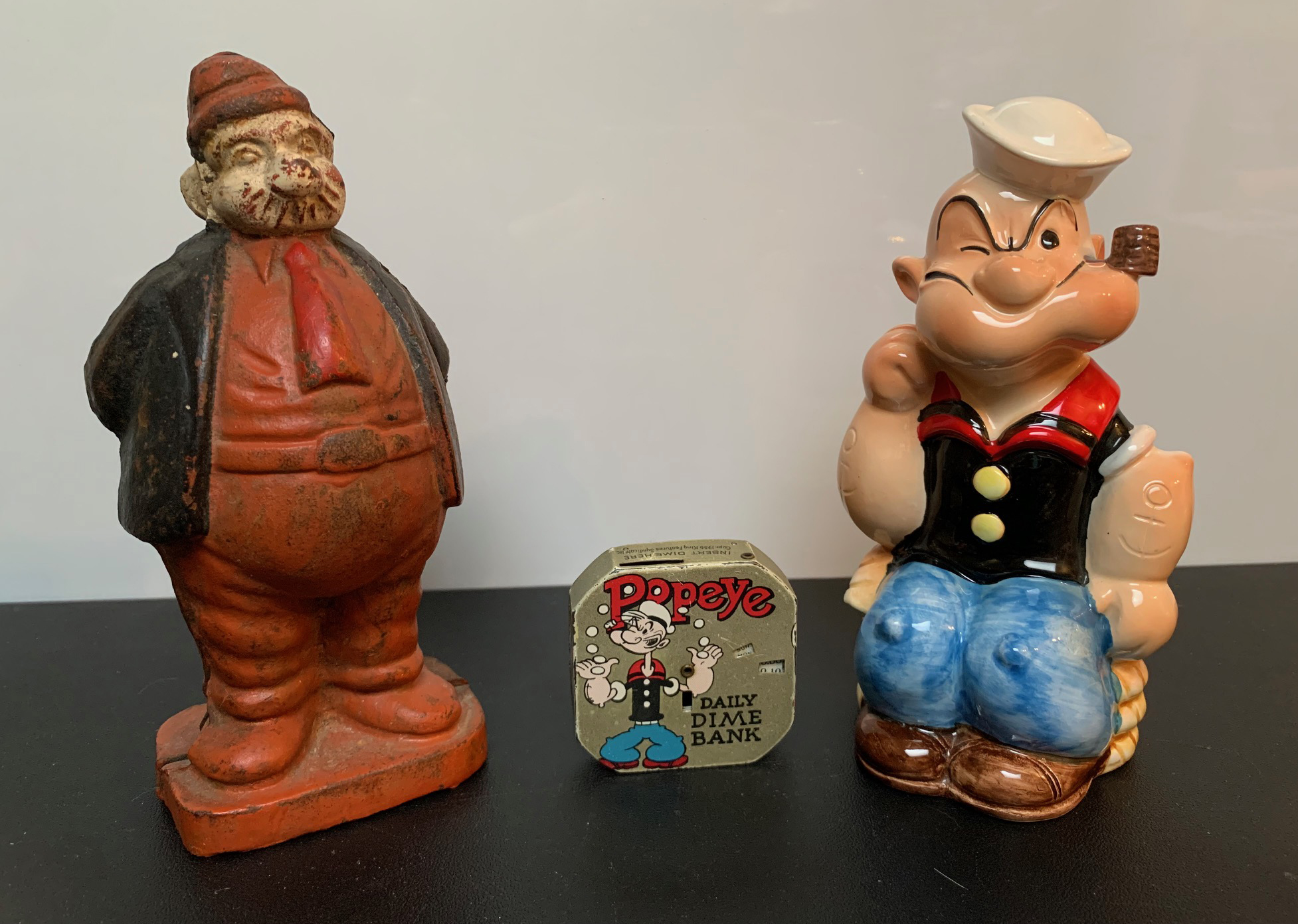 I don’t know if banks really qualify as toys, but here’s a small collection of them from various decades. The heavy, cast iron Wimpy bank doubles as a doorstop here at stately Morrison Manor, and is probably from the 1930s or ’40s. The metal daily dime bank with built-in counter is from 1956, and the ceramic Popeye bank was manufactured in 1980.