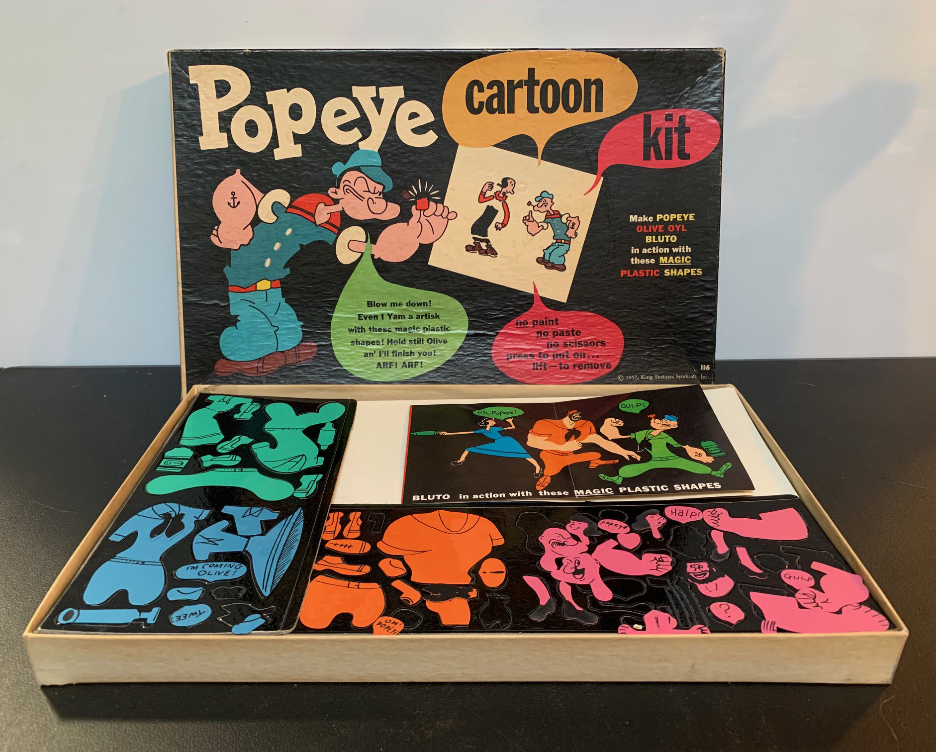I’ve always loved Colorforms! This Popeye Cartoon Kit features Popeye, Brutus, and Olive Oyl, with art based on the lackluster, made-for-TV cartoons of the late 1950s. As an adult, I don’t enjoy the low production values of those shorts, nor the cheap-looking art on these Colorforms, but as a kid, it was Popeye, and that was enough to get me excited. I do love the box art on this 1957 kit!