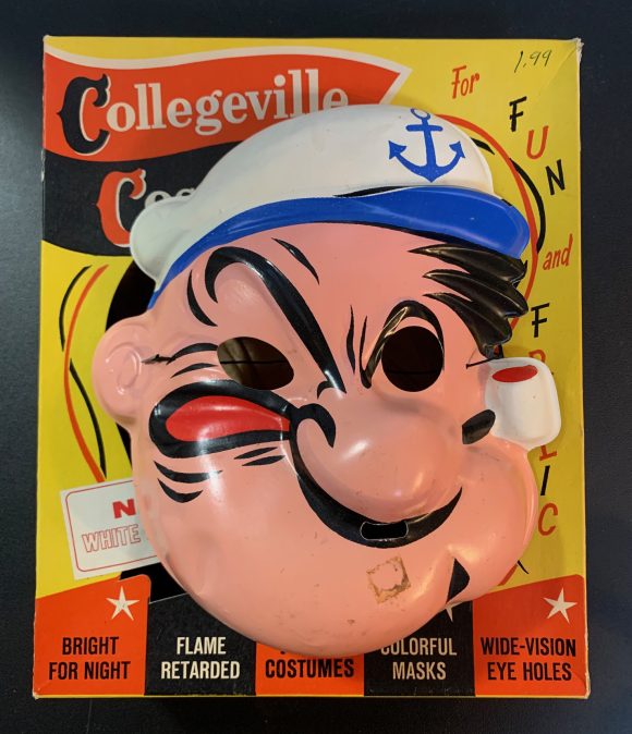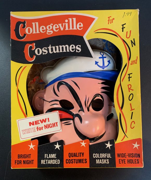 Based on the box design, I’d say this Collegeville Popeye costume is from the 1950s, but it doesn’t have a date. It also doesn’t have the plastic spinach can prop that originally came with this cool and unusual Halloween outfit.
