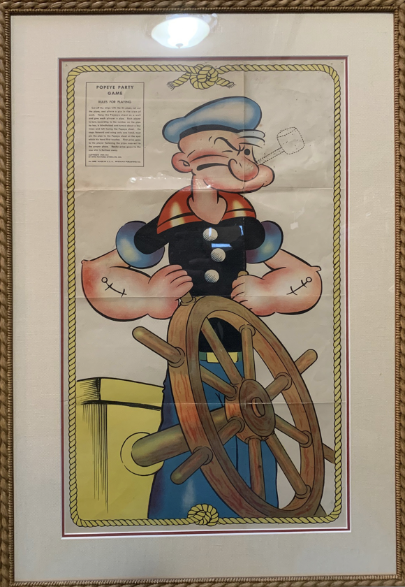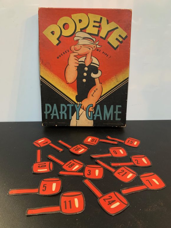 This Popeye Party Game is a riff on the birthday party standard, “pin the tail on the donkey.” In this case, party-going kids were blindfolded and had to pin the pipe on Popeye. This is from Whitman, manufactured in 1937. I love the airbrushed art of Popeye on the poster so much, I had it framed.