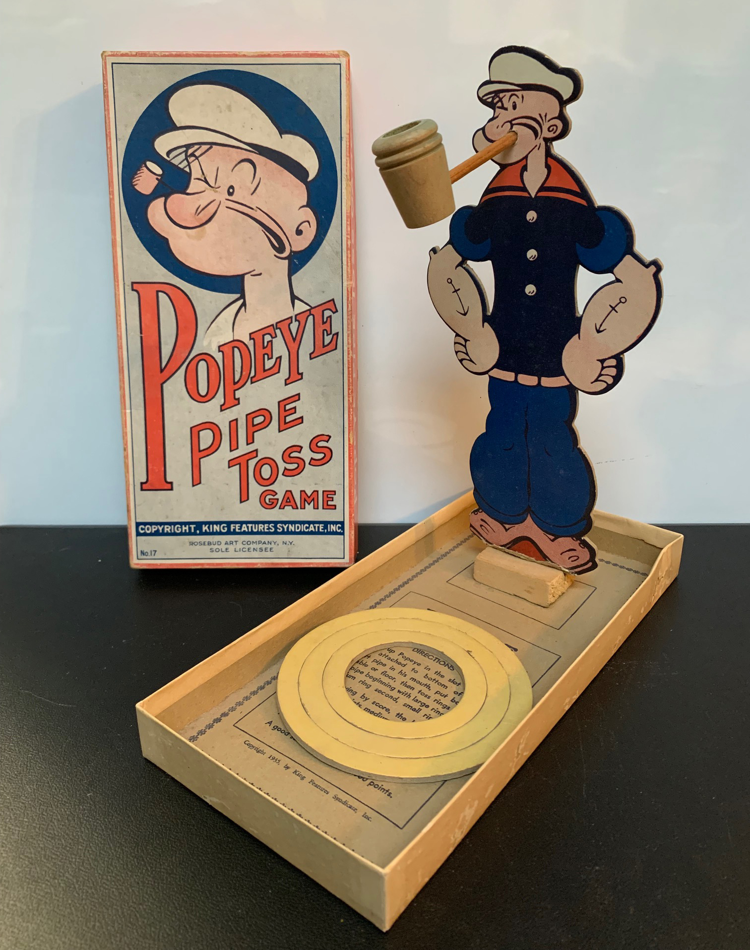 This unused Popeye Pipe Toss Game, manufactured by the Rosebud Art Company, is the oldest piece in my collection, dating to 1935.