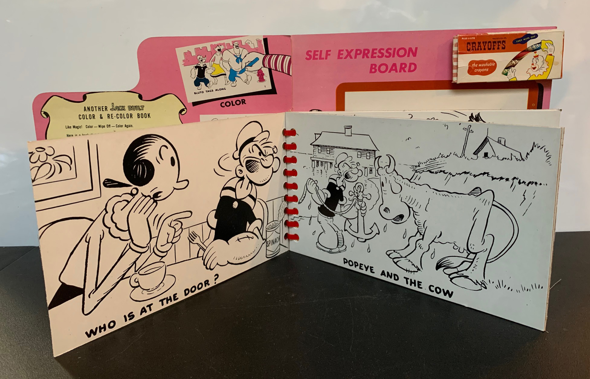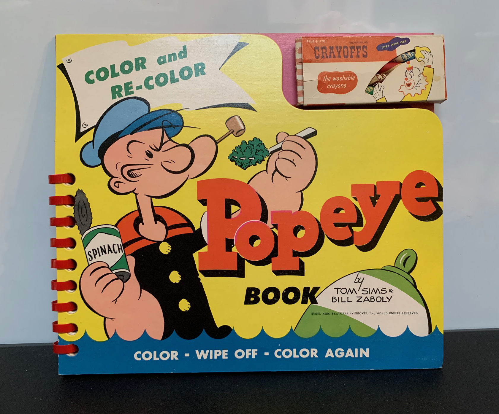 Tom Sims and Bill Zaboly were the writer and artist, respectively, on the Thimble Theatre comic strip when this “Color and Re-color” book was published in 1957. It’s nice to see that these talented and often forgotten Popeye creators were able to pick up some dough on the side by working on merchandise.