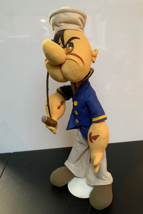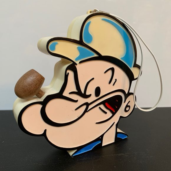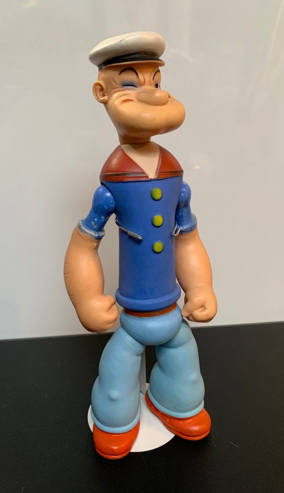 I was introduced to the one-eyed sailor through Popeye and His Pals, a local TV show from Windsor, Ontario, that we picked up across the Detroit River in the Motor City. The show was emceed by two sailor-themed kiddie show hosts, Captain Jolly on weekdays, and Poopdeck Paul on the weekends. I was plopped down in front of the TV set pretty much every day to watch that show, and it made me an avid Popeye fan, so naturally, Popeye toys were a part of my childhood. But it was as a young professional artist that I began collecting Popeye toys and other merchandise, due to a more serious interest in the Fleischer cartoons, and to reading the early comic strips in a series of books published by Fantagraphics.
