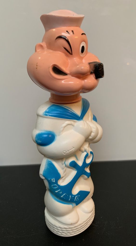 In the 1960s Soaky bubble bath always made bath time fun. A few decades ago, I had a huge collection of Soaky bottles featuring just about every cartoon character you can imagine, from Huckleberry Hound to Jiminy Cricket. That collection took up a lot of space, so I ended up selling most of it. But of course, along with Batman, Robin, Superman, and the Universal Monsters, I kept this wonderfully off-model Popeye bottle.