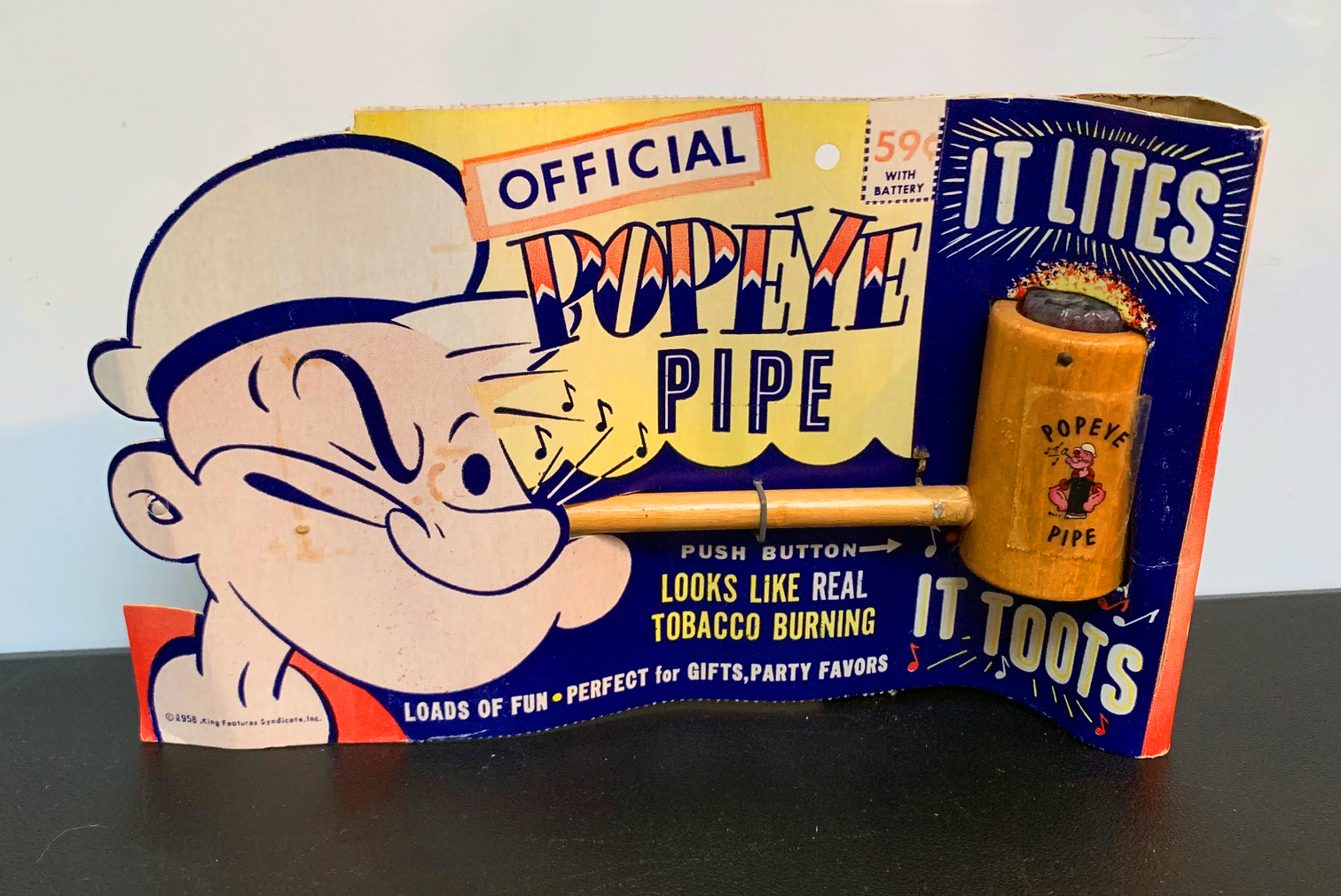 Speaking of play-time pseudo tobacco-use for kids, here’s a Popeye pipe toy from 1958 that both lights up (to look like real tobacco burning!) and toots!