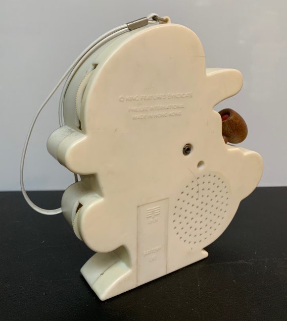 Before Spotify and iTunes, and even before Walkmans, kids took their music with them via transistor AM radios. This cool Popeye radio, complete with carry strap and wooden pipe, was made in the swingin’ ’70s by Philgee International in Hong Kong.