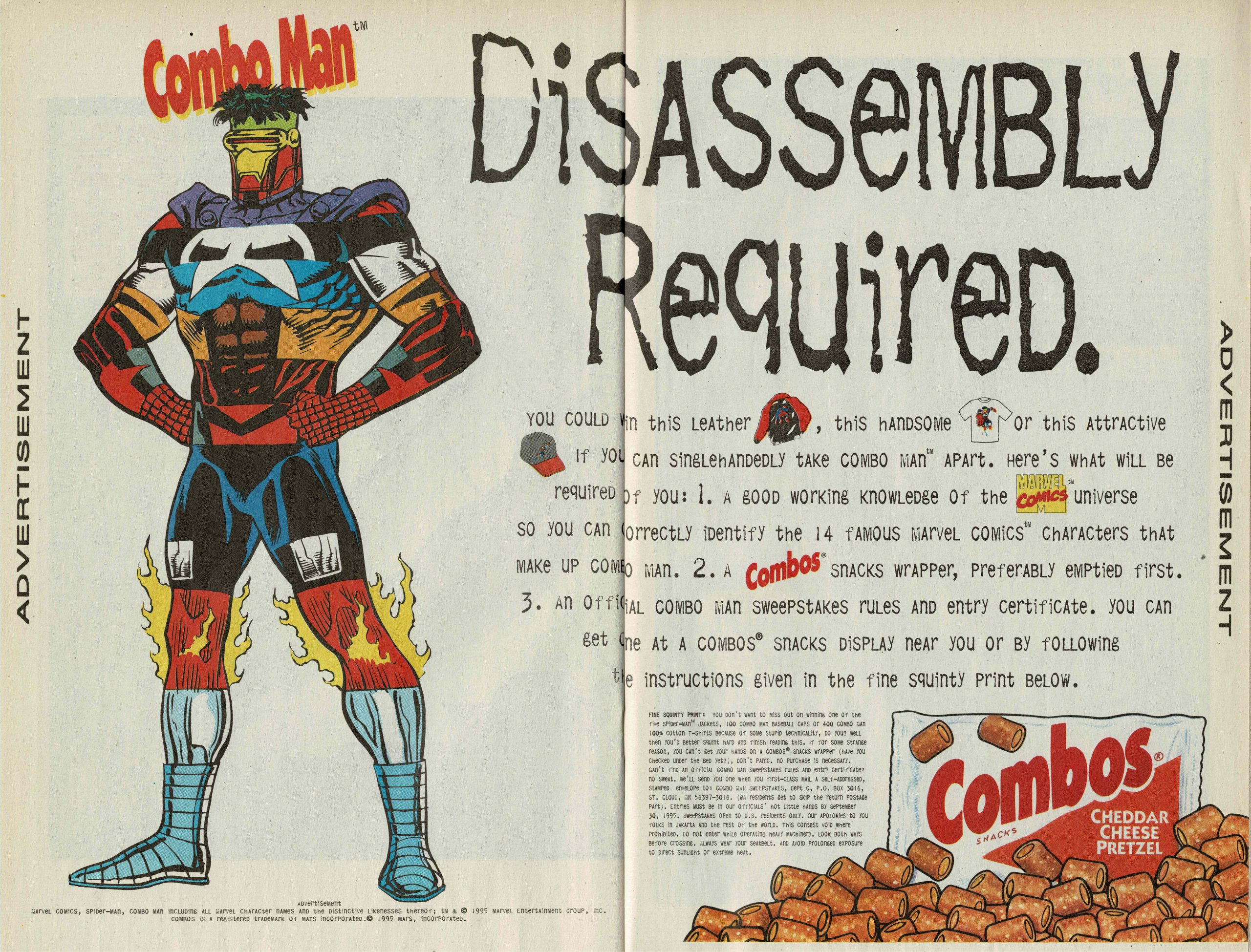 Combo Man May Look Like A Hero, But Inside, He’s Kinda Cheesy. This 1990s mega-mashup is eye-catching and his design is  quite well done, but he’ll never beat Jack Kirby’s Super-Adaptoid. And with a heart of cheddar cheese and armor made of pretzels, shouldn’t Combo Man be holding up a huge mug of German beer?