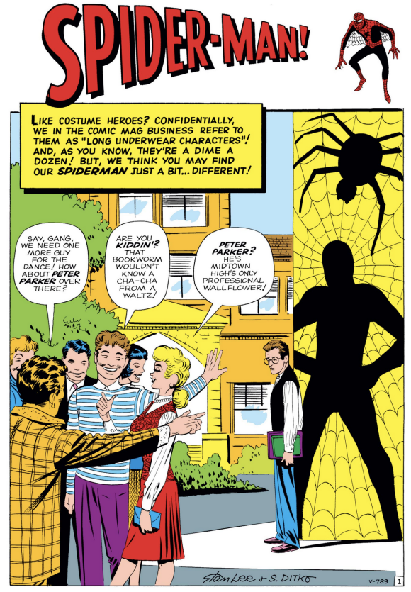 Everybody talks about his offbeat anatomy and, in particular, his expressive hands. Ditko hands, fingers wildly splayed or tightly curled, wrists bent at 90-degree angles, attached to figures that twist and stretch to reflect their physical, emotional, moral, or even metaphysical struggles. He rejected the explosive heroic action of contemporary comics and seemed to approach his characters from the inside out, giving them weight and substance, and defining them at a glance; even without the dialogue on the splash page of the Spider-Man origin story in Amazing Fantasy #15 telling us that Peter Parker is a “wallflower,” Ditko’s isolated, downcast figure in the background tells us everything we need to know about the character.