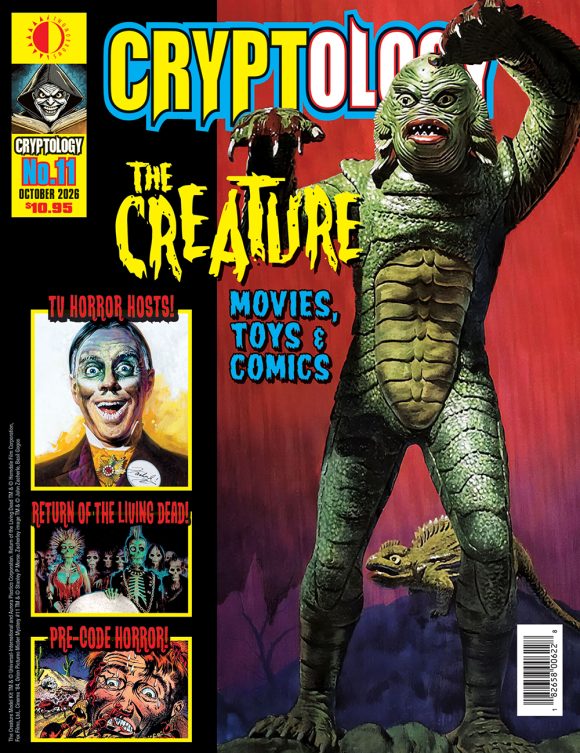 “Just when you thought it was safe to venture into the water again, I, the Cryptologist, have plunged into the depths to bring you the Creature from the Black Lagoon! You lucky people will see glimpses of his three mind-blowing films, along with the lady behind this magnificent specimen, none other than Milicent Patrick herself. We’ve got comic books from the black lagoon, along with models and memorabilia galore, and the amazing prehistoric history that spawned the creature. If this isn’t enough, you’ll meet some of my old horror host buddies who first introduced classic spine-tingling films for television. I’ve also thrown in The Golem, from silent cinema right up until The Limehouse Golem, plus the comic books to boot. Bill Stout will be popping by to reminisce on the putrid carrying-on in The Return of the Living Dead; sounds like fun to me! Our gruesome pre-Code comics retrospective continues, and it wouldn’t be Cryptology if we didn’t dig into one of those old Hammer horror movies. So if you dare, pick up this new issue of my creepy magazine by editor Peter Normanton, the perfect read for you retro horror fans!”