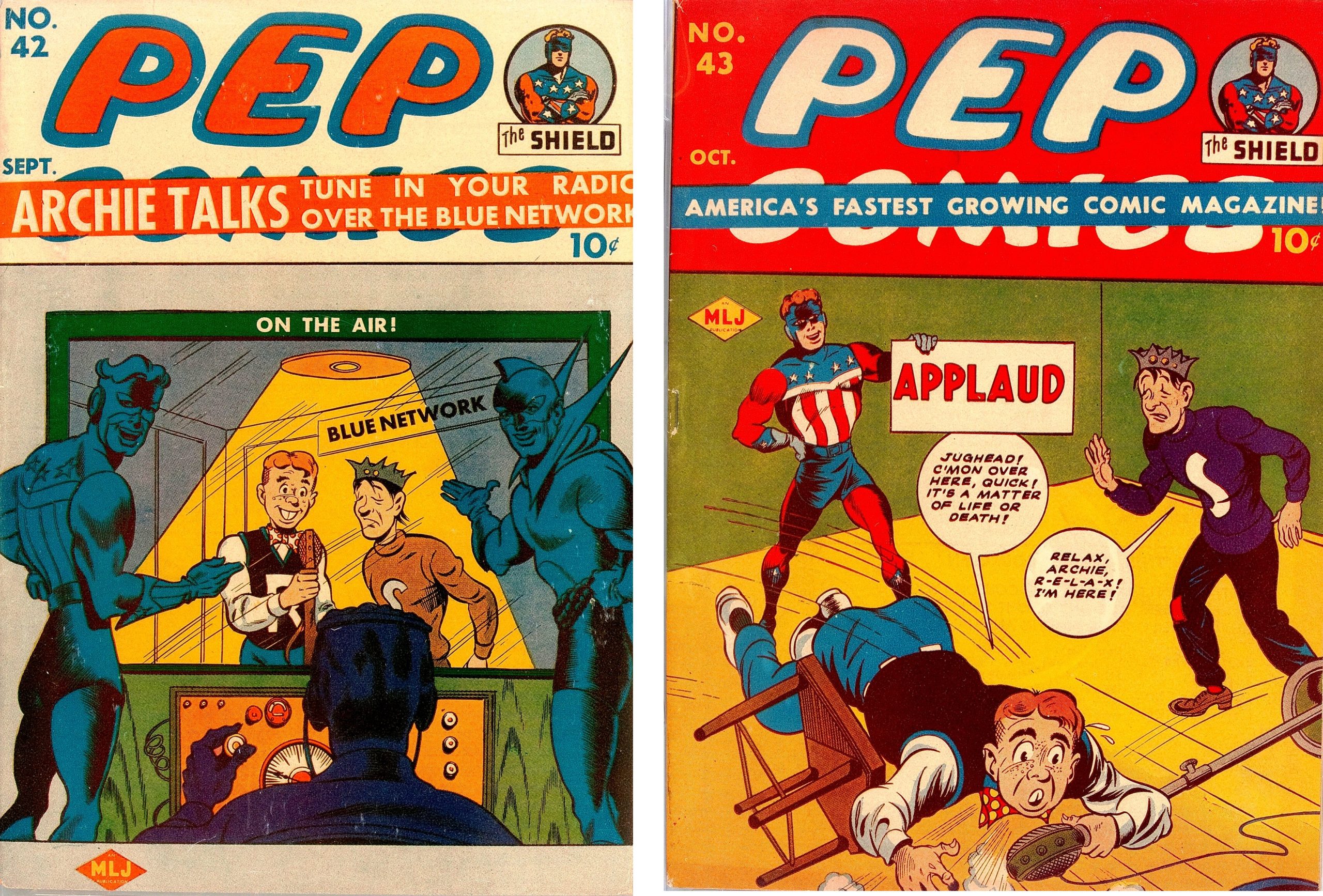 Check out this pair of promo covers for the new show, both drawn by Bob Montana — Pep Comics #42 (Sept. 1943) and #43 (Oct. 1943):