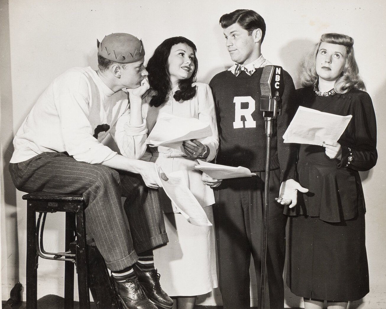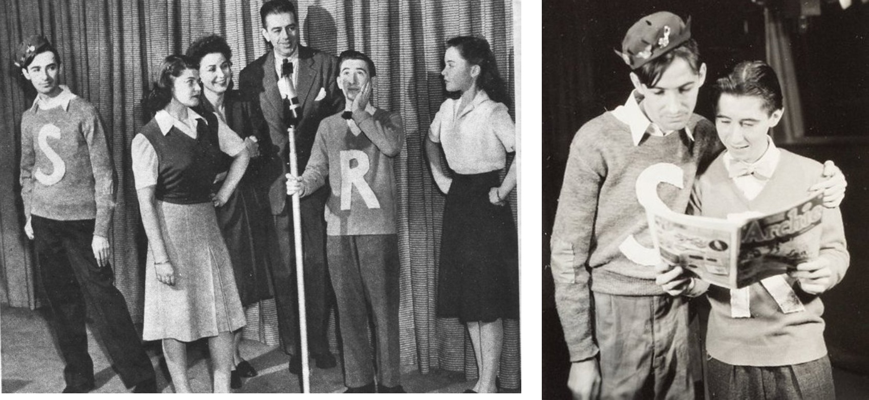 The 1944 Archie Andrews cast: (L-R) Cameron Andrews (Jughead), Vivian Smolen (Veronica), Peggy Allenby (Mary. Andrews), Reese Taylor (Fred Andrews), Jack Grimes (Archie Andrews), and Joy Geffen (Betty). (Right) Cameron Andrews and Jack Grimes checking out the source material.