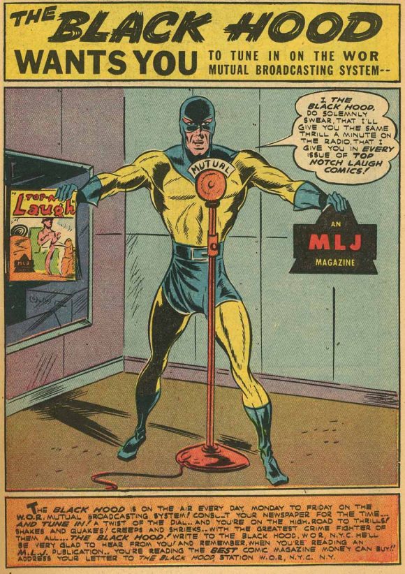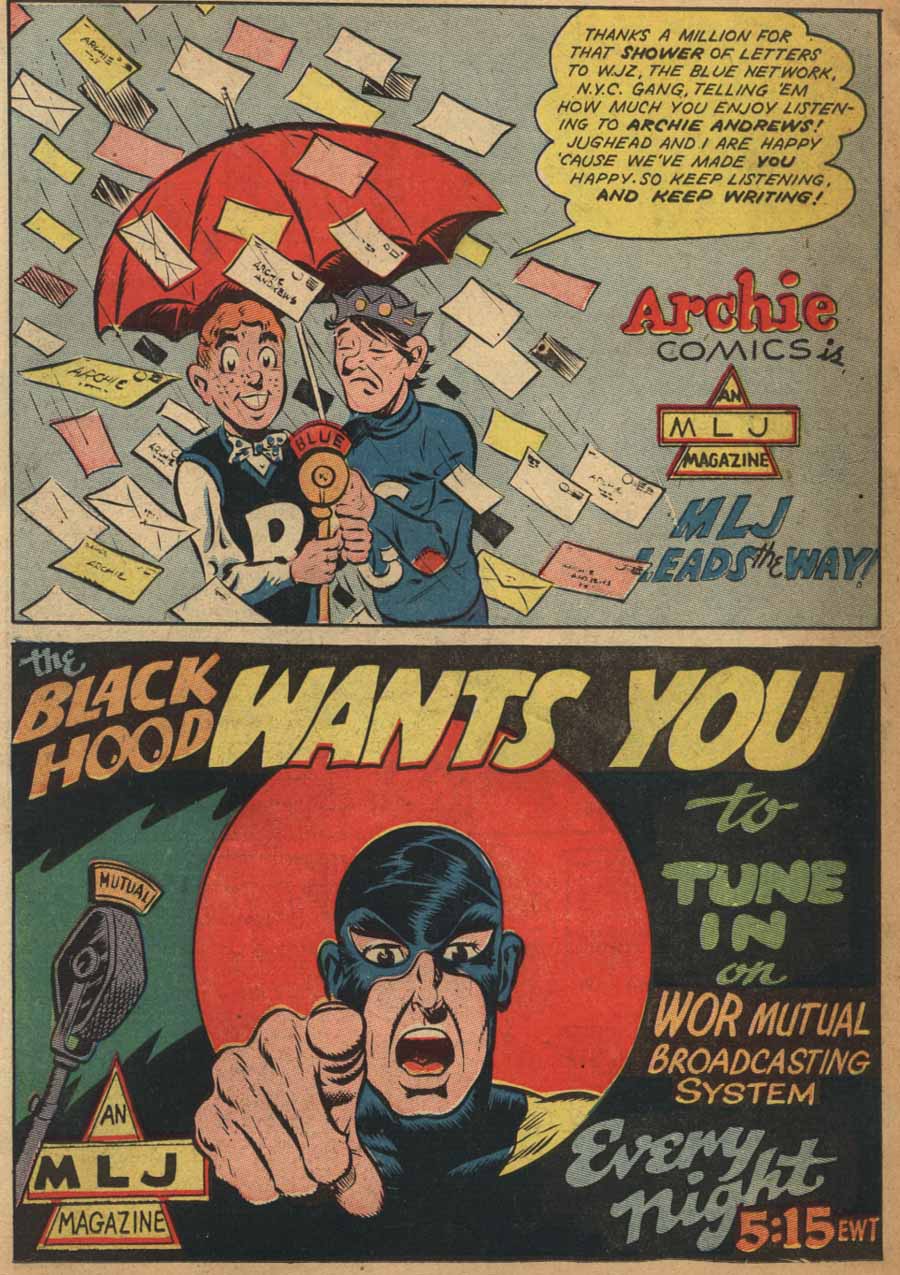 Ads within the comics appeared for both programs, such as this one from Zip Comics #43 (Jan. 1944), which had the top half highlighting the success of Archie Andrews, while the lower half for The Black Hood almost appeared to be a cry for help.