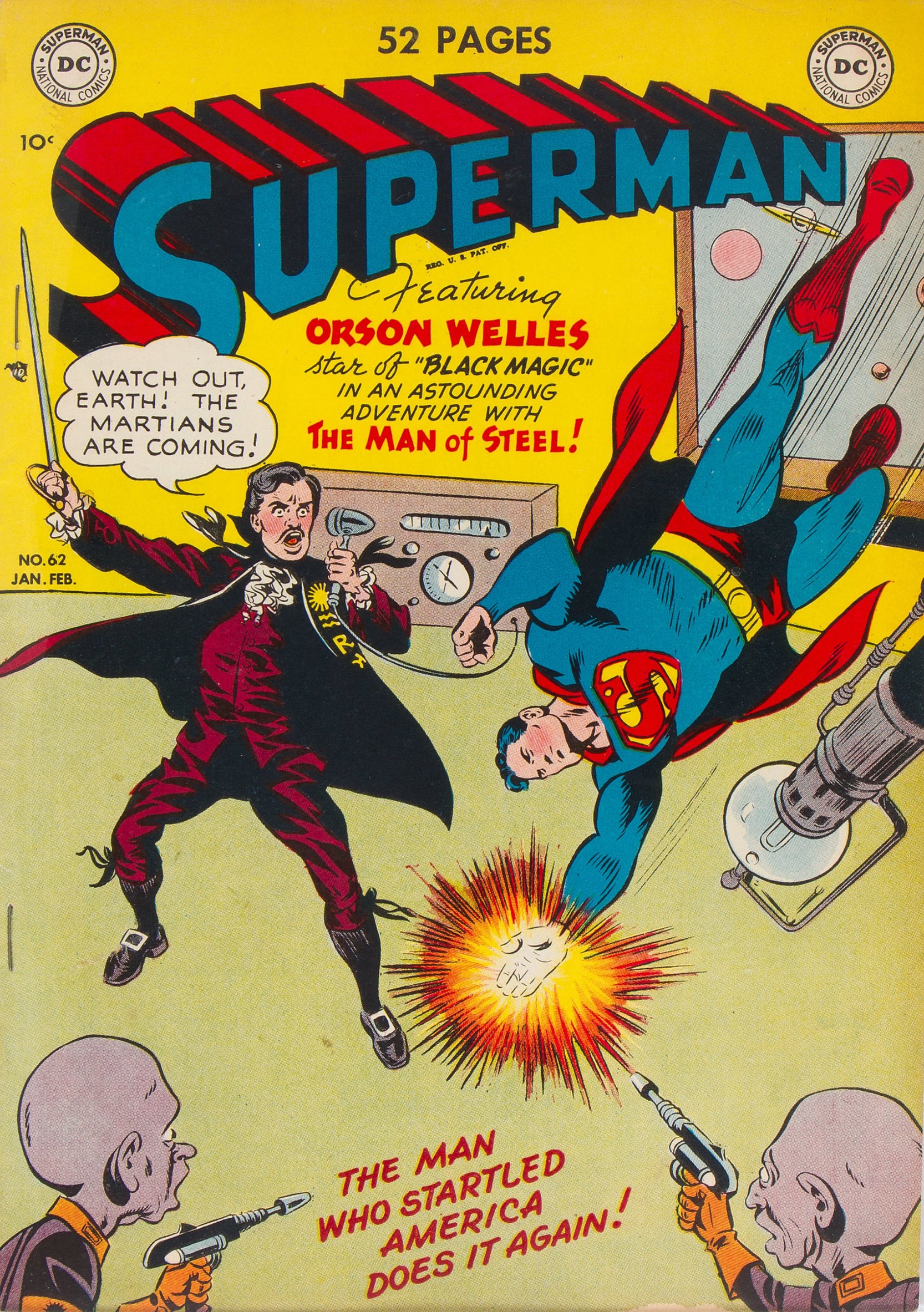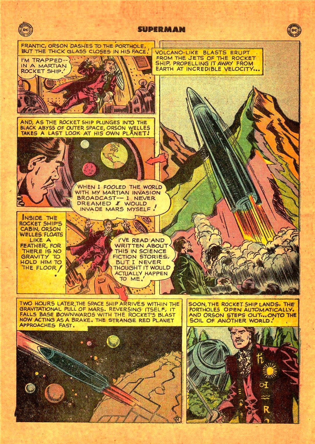 Several years after the broadcast, DC Comics featured a story in Superman #62 (Jan.-Feb. 1950) in which Welles, just coming from the filming of his latest movie, Black Magic (1949), discovers a rocket and, filled with curiosity, enters it. Unbeknownst to him, however, on the other side of the hill are scientists ready to launch it by remote control to Mars for investigation of the planet.
