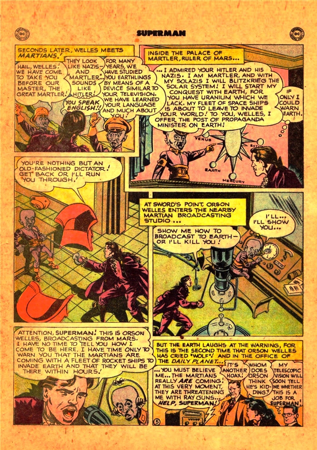 They push the button and off the rocket goes, with Welles inside — destination: Mars. Upon landing, he’s brought before an Adolf Hitler-like Martian dictator about to start an invasion of Earth. Welles manages to break free of his captors and quickly broadcast a message to Earth to warn of the invasion, but everyone remembers the radio program and laughs it off. Only Superman, using his telescopic vision all the way to Mars, knows it is true and flies there to aid Welles in defeating the would-be conqueror.