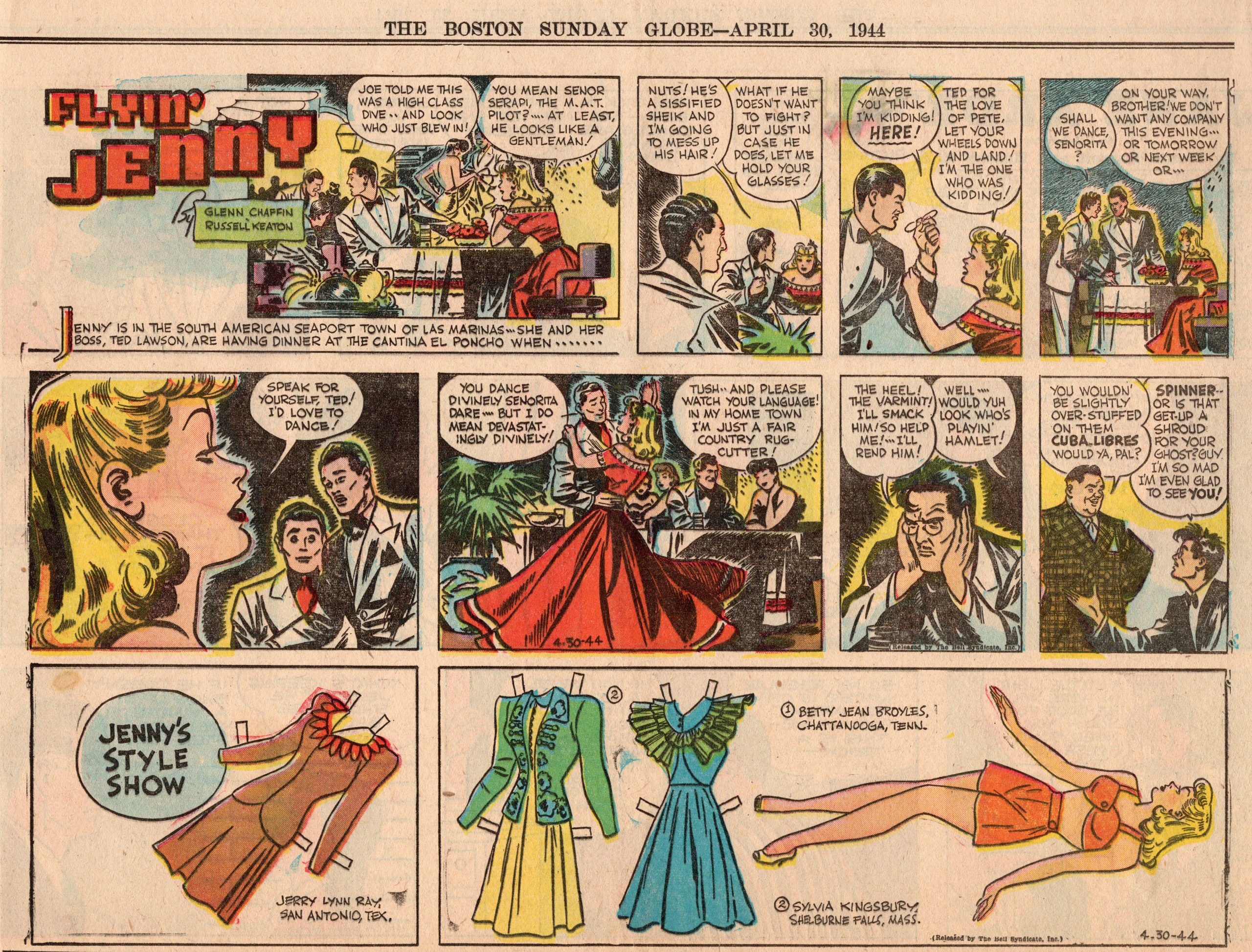 I don’t recall seeing paper dolls in Sunday newspaper comics as a kid. I think by the 1960s they must have fallen out of fashion (so to speak) as strips were given less space on the page. At least, the strips that appeared in the paper my parents subscribed to, The Detroit News, didn’t feature them. But as an adult I discovered to my delight that they were ubiquitous in strips from the ’30s and ’40s, like Brenda Starr, Reporter — whose 85th birthday happens to be today — Dixie Dugan, Terry and the Pirates, Flyin’ Jenny, Tillie the Toiler, Blondie and Dagwood, and many more.