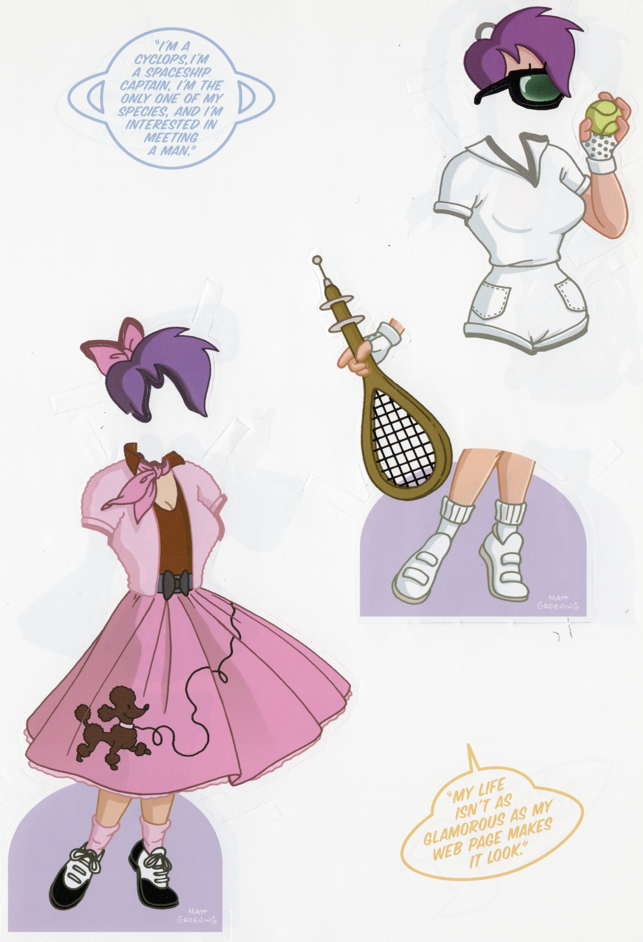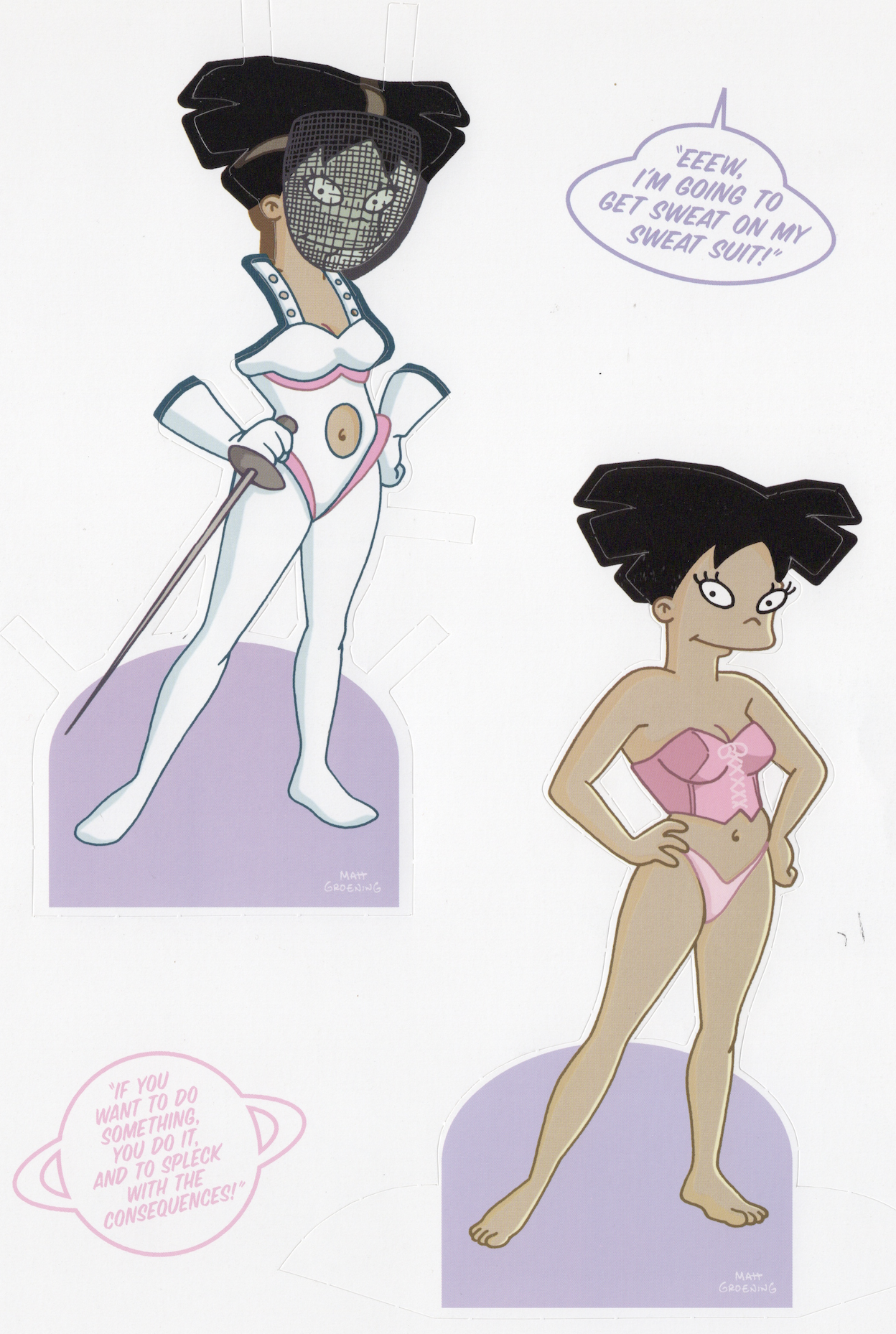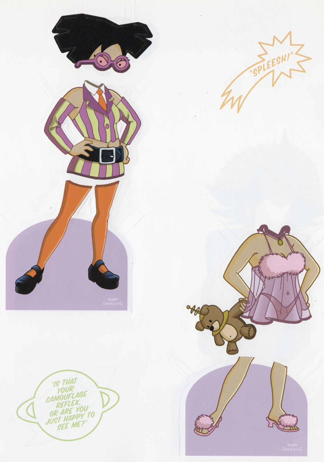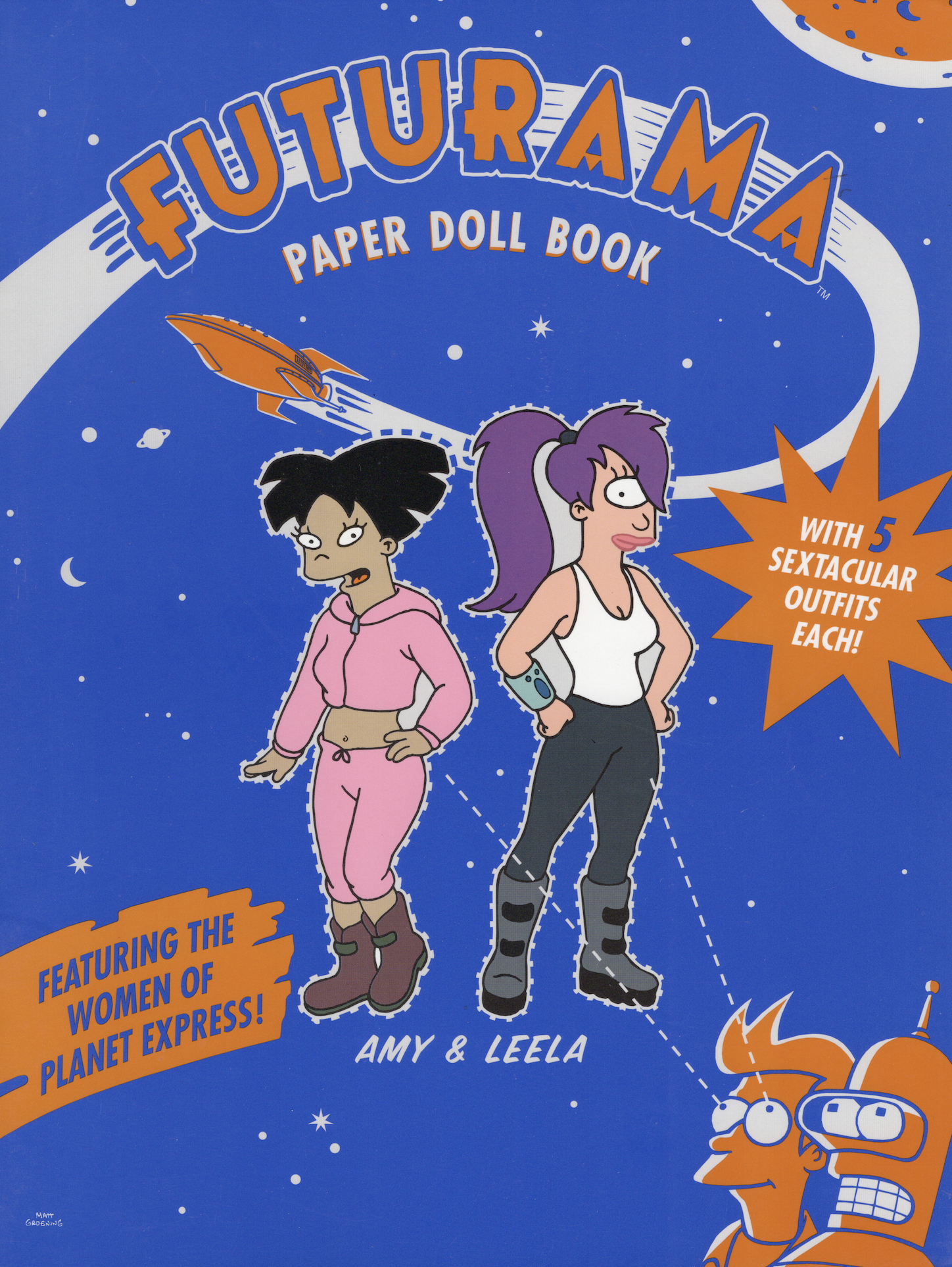 I also got to draw an entire book of paper dolls featuring Amy and Leela from Futurama! The book was published by Dark Horse, who had a license to create Futurama merchandise in the early 2000s. This time, the fashion designs were provided by co-producer Mili Smythe, and I handled the renderings of Leela and Amy in their unmentionables, along with their out-of-this-world fashions!