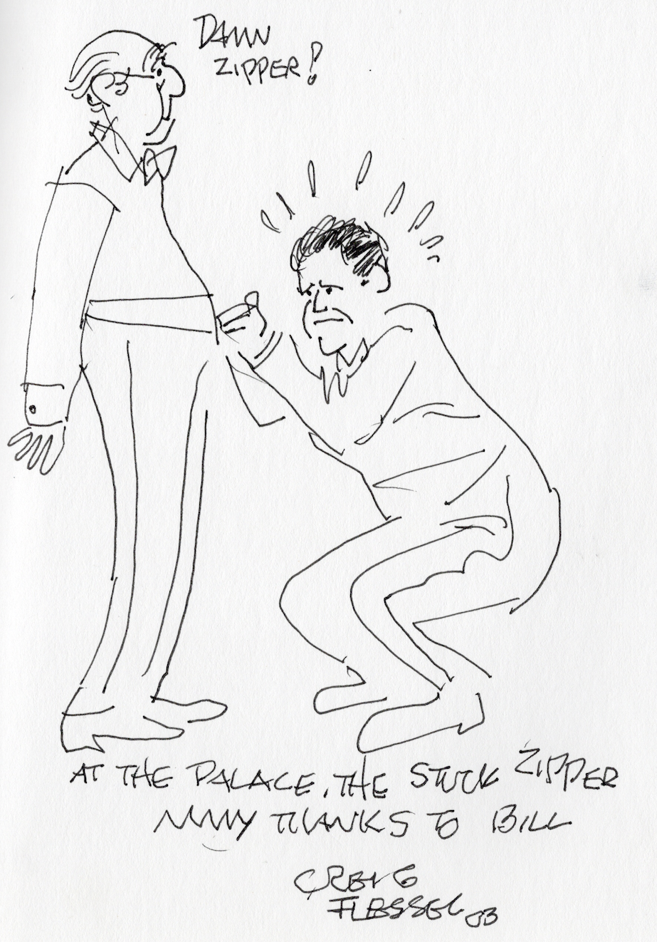 No, he did not. What he drew was way better than any superhero sketch. Creig gave me a lasting memory in pen and ink, of our meeting in the washroom. And like a true cartoonist, he made it even funnier by adding drops of sweat flying from my brow, and changing the side tabs of the trousers to a stuck zipper!