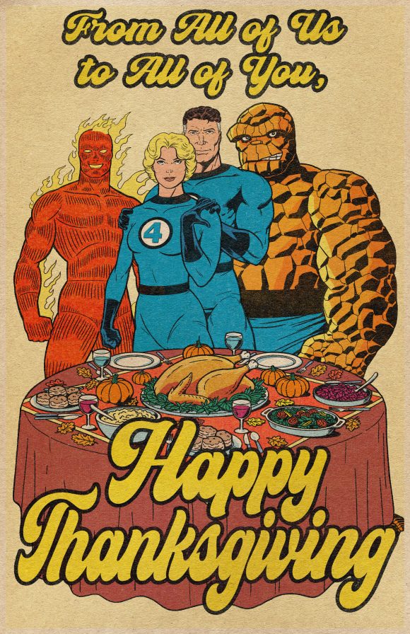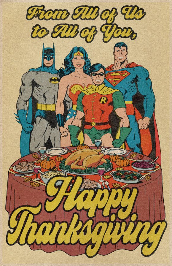I love the holiday season. Halloween to Christmas is my favorite time of year, and it’s even more so when I get inspired to make Bronze Age-style comic art that puts our favorite heroes in the spirit. Hopefully in upcoming weeks I can share some of that with you, but today let’s talk turkey. Because it’s Turkey Day!