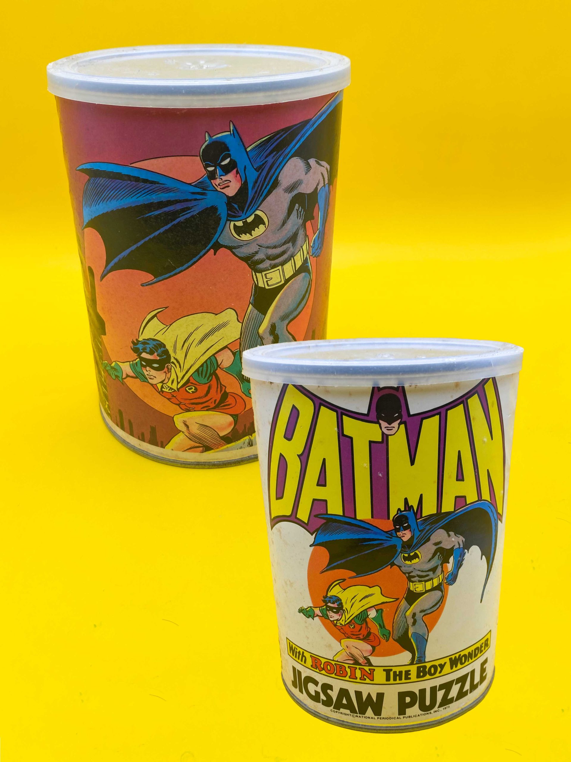 Jigsaw Puzzle – American Publishing Corp, 1973. American Publishing Corp. released several DC-themed puzzles in the ’70s, and some of them were produced in a unique fashion: in a cardboard can with plastic lid, much like a container of peanuts! This 1973 puzzle reprints the most iconic image of the Dynamic Duo with some minor recoloring, and without the “Best Bat-Wishes” text.