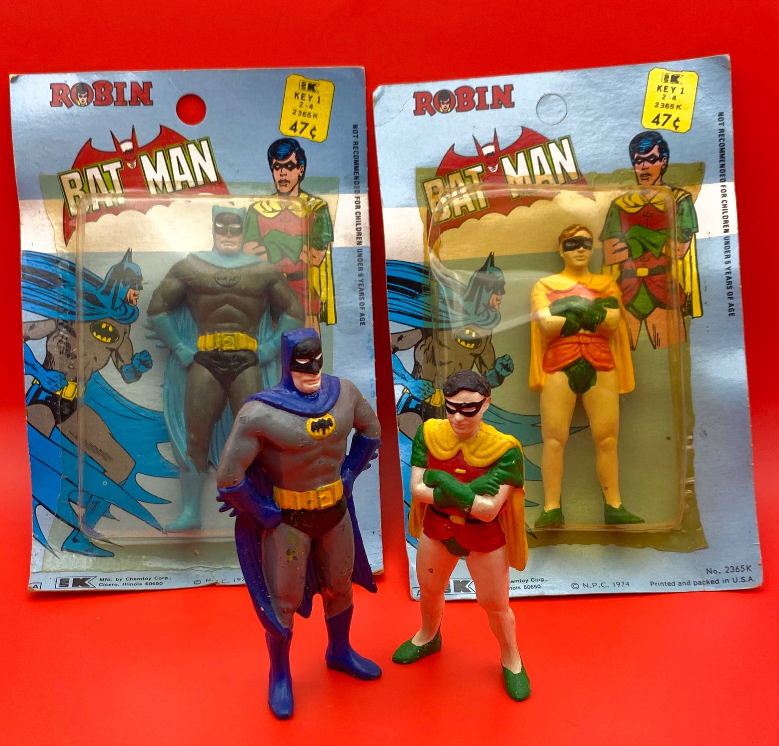Take one look at these repainted loose examples I found nearly 40 years ago at a local swap meet, and you can see the sculpts are quite nice and capture the standing images of the Caped Crusaders by Infantino/Anderson perfectly!