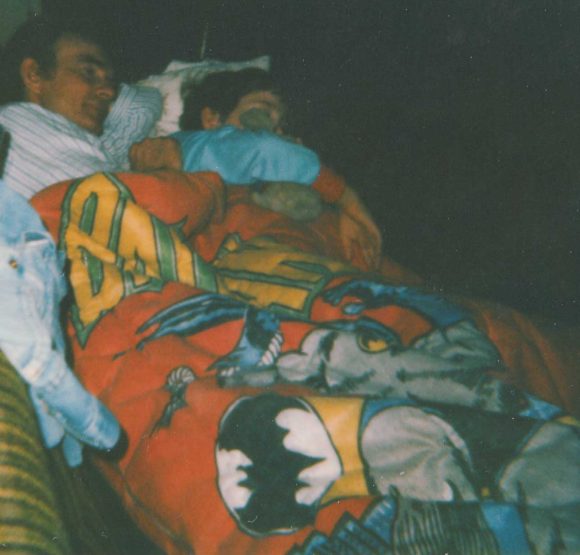 My Dad and I napping on the couch under my Batman (swinging pose) and Robin sleeping bag.
