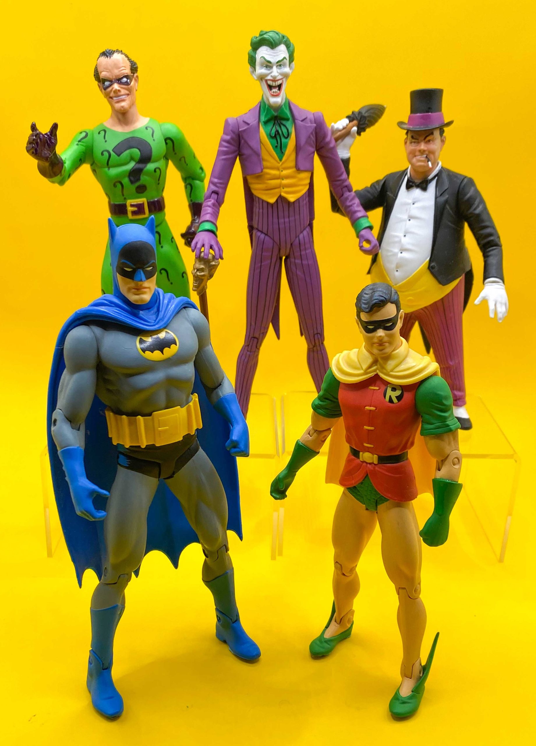 The Classic Silver Age/First Appearance Action Figures – DC Direct, 2003-05. DC Direct kicked off their production of Batman figures with a two-pack containing Silver Age iterations of the Dynamic Duo. They continued with sets featuring Joker and Batgirl, and then Penguin and Catwoman. The figures (minus Catwoman) are all directly based on Carmine Infantino and Murphy Anderson’s interpretations of the characters, as is the Riddler, who was released in DC Direct’s First Appearance line, based on his Silver Age return in Batman #171 (May 1965).