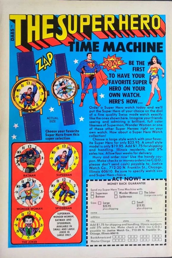 Batman Wristwatch – Dabs, 1977. Dabs and Co. advertised their “Super Hero Time Machine” wristwatches on the backs of DC Comics in 1977. It was a rare opportunity for Spider-Man to appear on the (back) cover of a DC publication! Superman, Wonder Woman, Batman and the Joker were offered from the DC set, with the latter two’s art hailing from the pinup set. Joker was only available in large adult sizes, because kids shouldn’t be promoting super criminals! His inclusion should silence those who seem to think the Joker WASN’T Batman’s No. 1 foe since the very beginning… because he was.