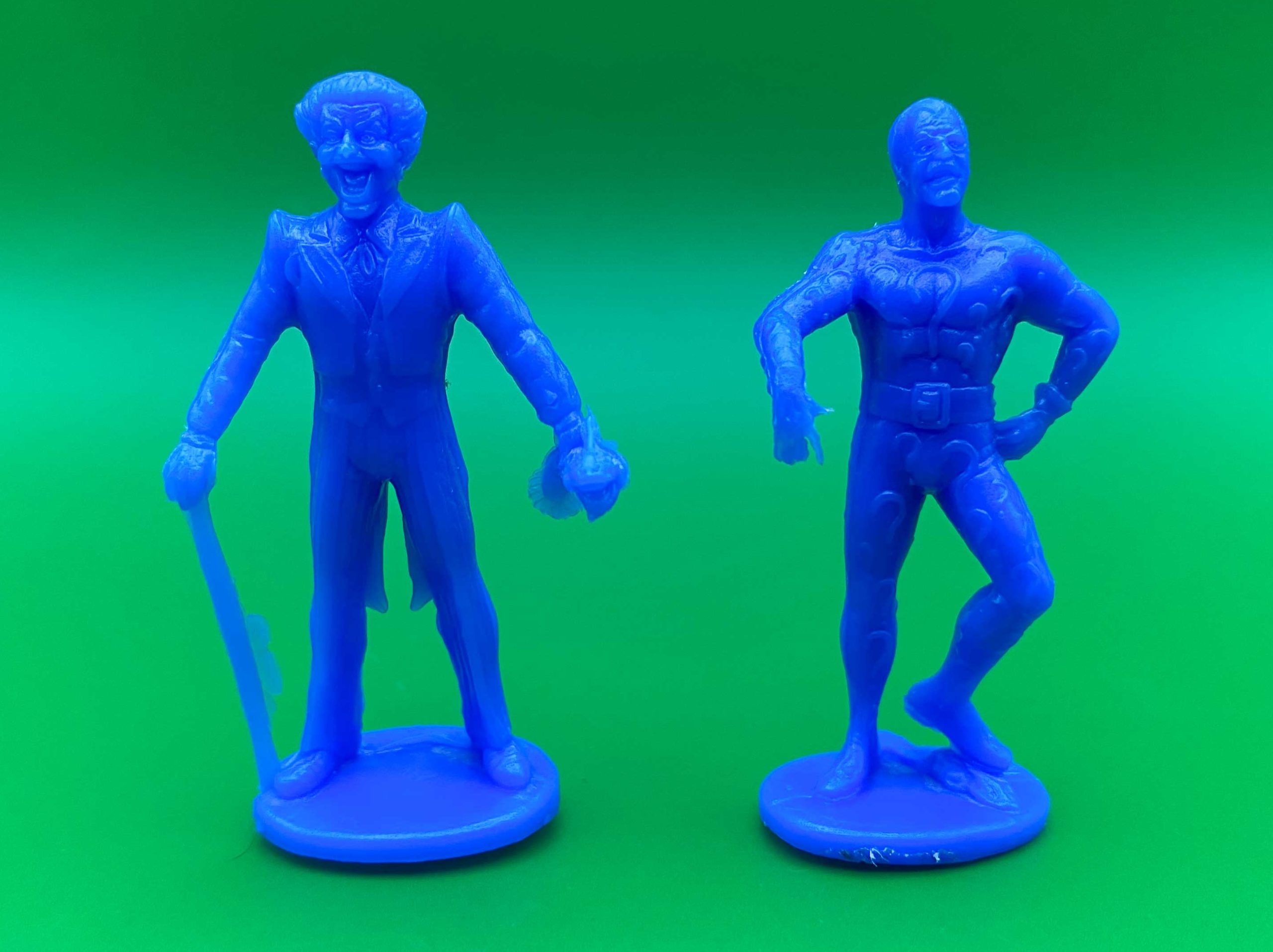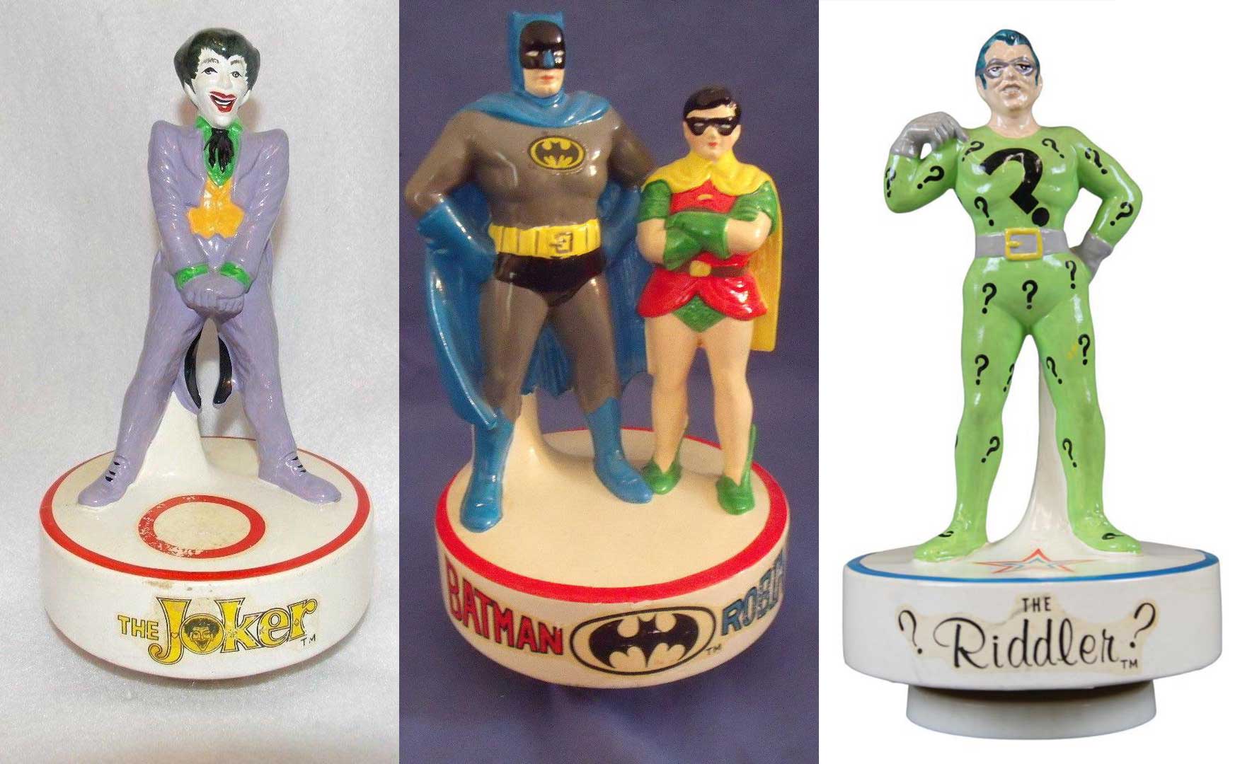 Joker and Riddler Figurines – Gulliver, 1981. I’ve showcased this Joker figure before, but it’s worth sharing again, especially since he’s paired with another Bat-rogue. These figures were produced by Brazilian/Argentinian toy manufacturer Gulliver in a promotion with Pepsi. The Riddler is straight out of the classic pin-up, finger pointing strangely down, leg cocked. But the Joker takes the pin-up image and adds a then fairly new comic element: the Laughing Fish from the Englehart/Rogers/Austin run of Detective Comics! This was the first toy/figure to feature the poisoned sea life, and it would become a common accessory with Joker figures in the decades to come.
